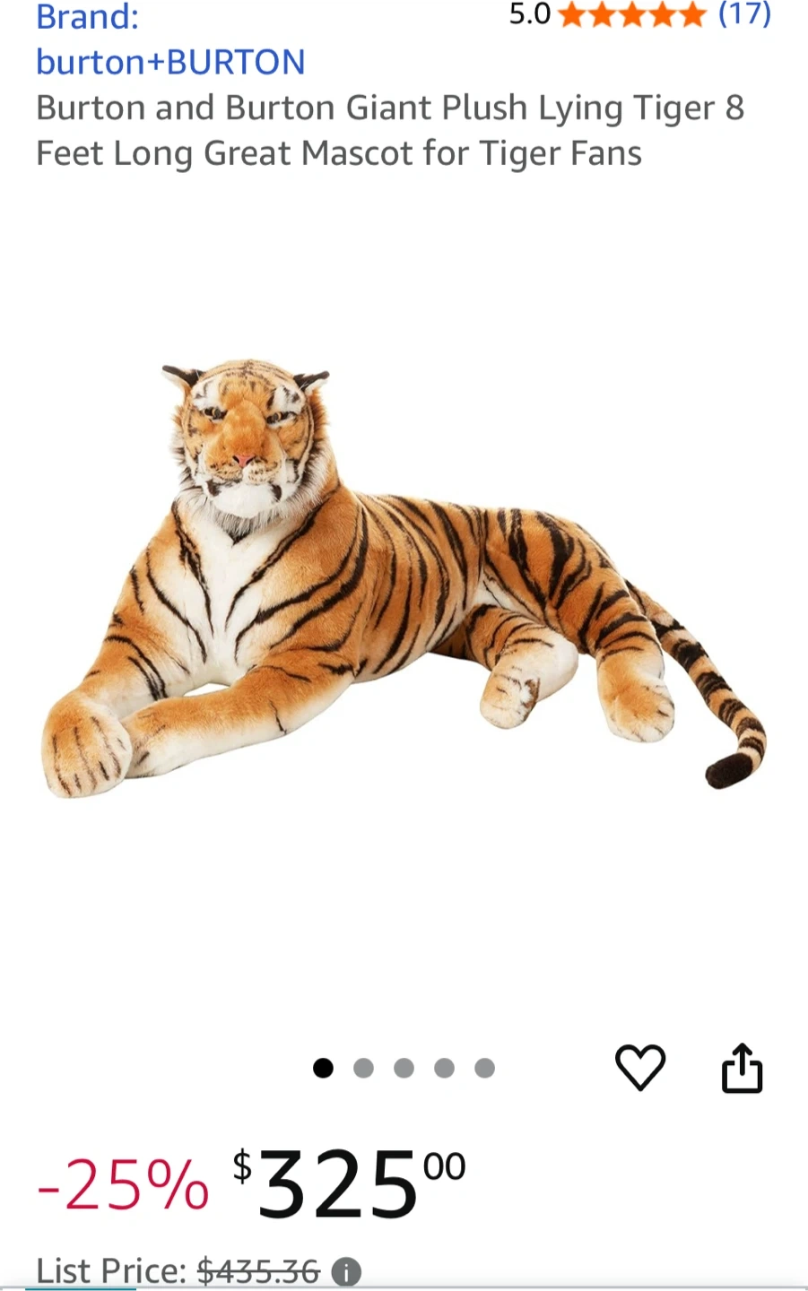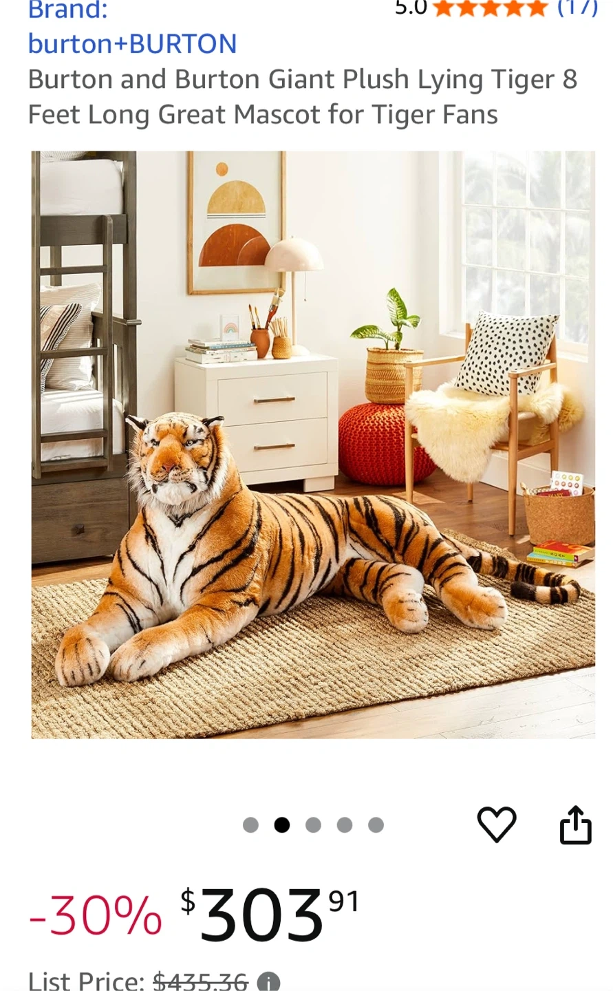 Selling a huge and cuddly Burton and Burton Giant Plush Lying Tiger! It's 8 feet long, making it a great mascot for tiger fans. The plush is in great condition , clean and ready to bring joy to its new owner. Kids love it. Can be used on parties with tiger theme or nursery room. It sells for $303-$325 on Amazon. Open to offers. Pick up in Pilsen.