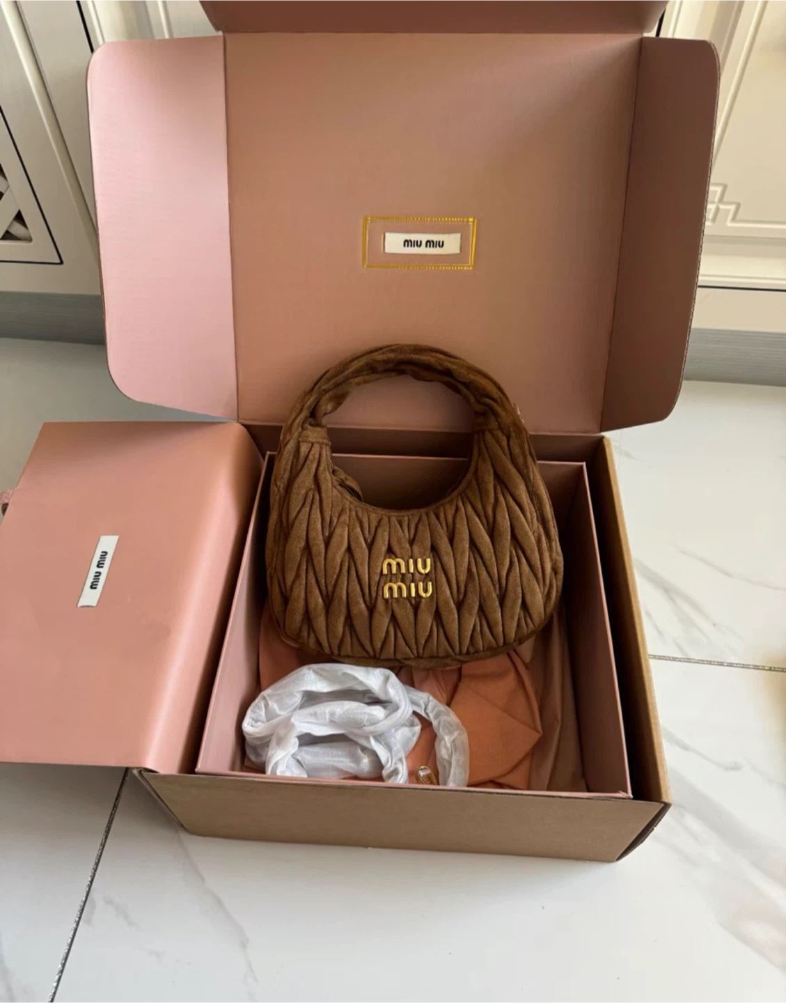This Miu Miu hobo bag is crafted from soft brown suede with the signature matelassé stitching. It features a top zipper closure and a gold-tone Miu Miu logo at the front. Includes original box and dust bag. A chic accessory for everyday wear!