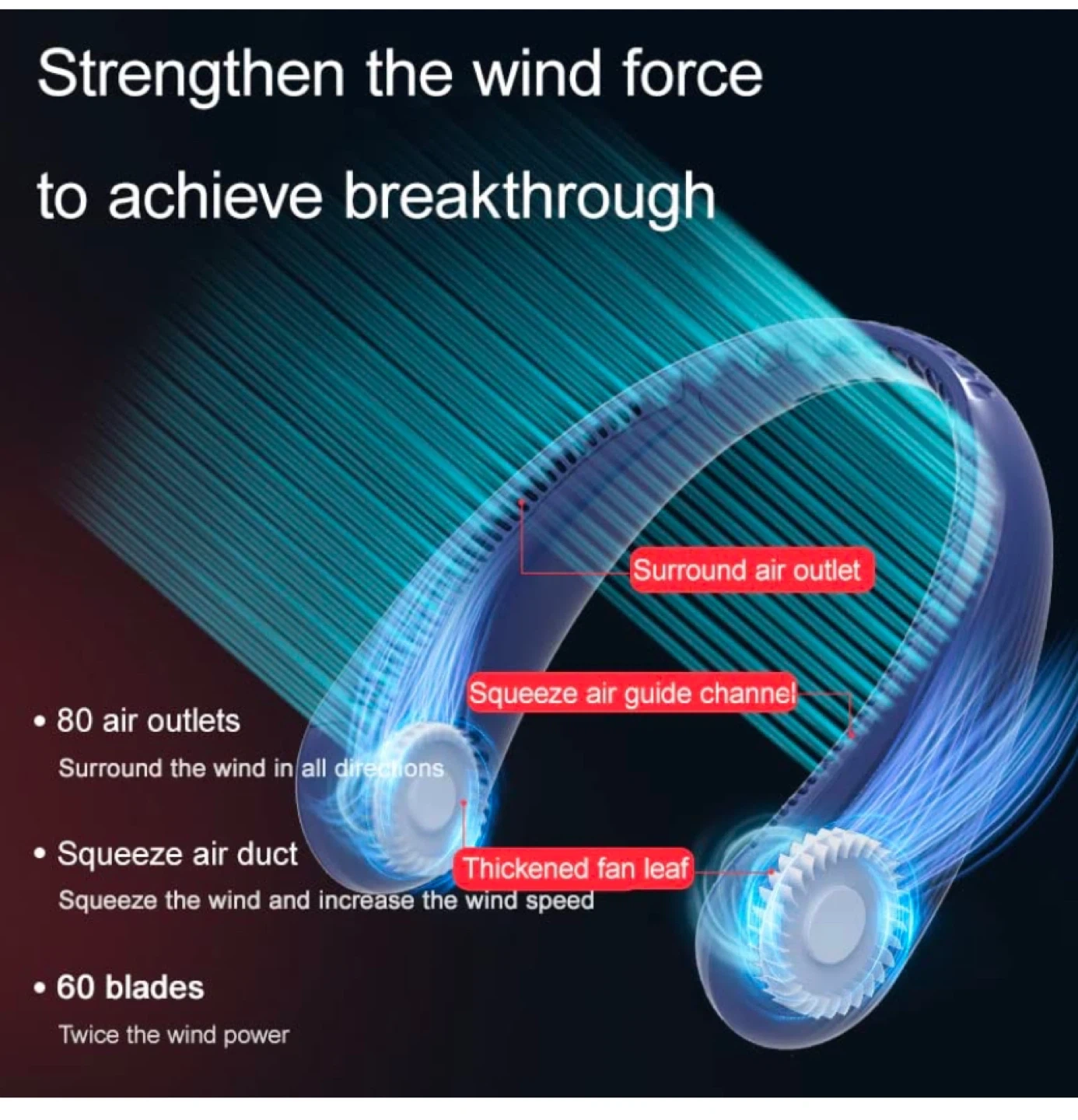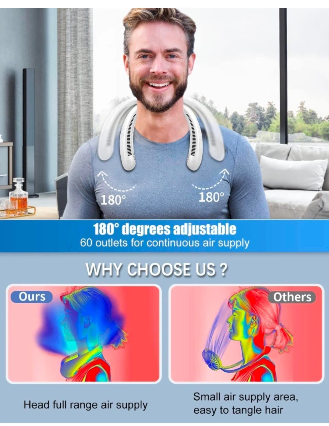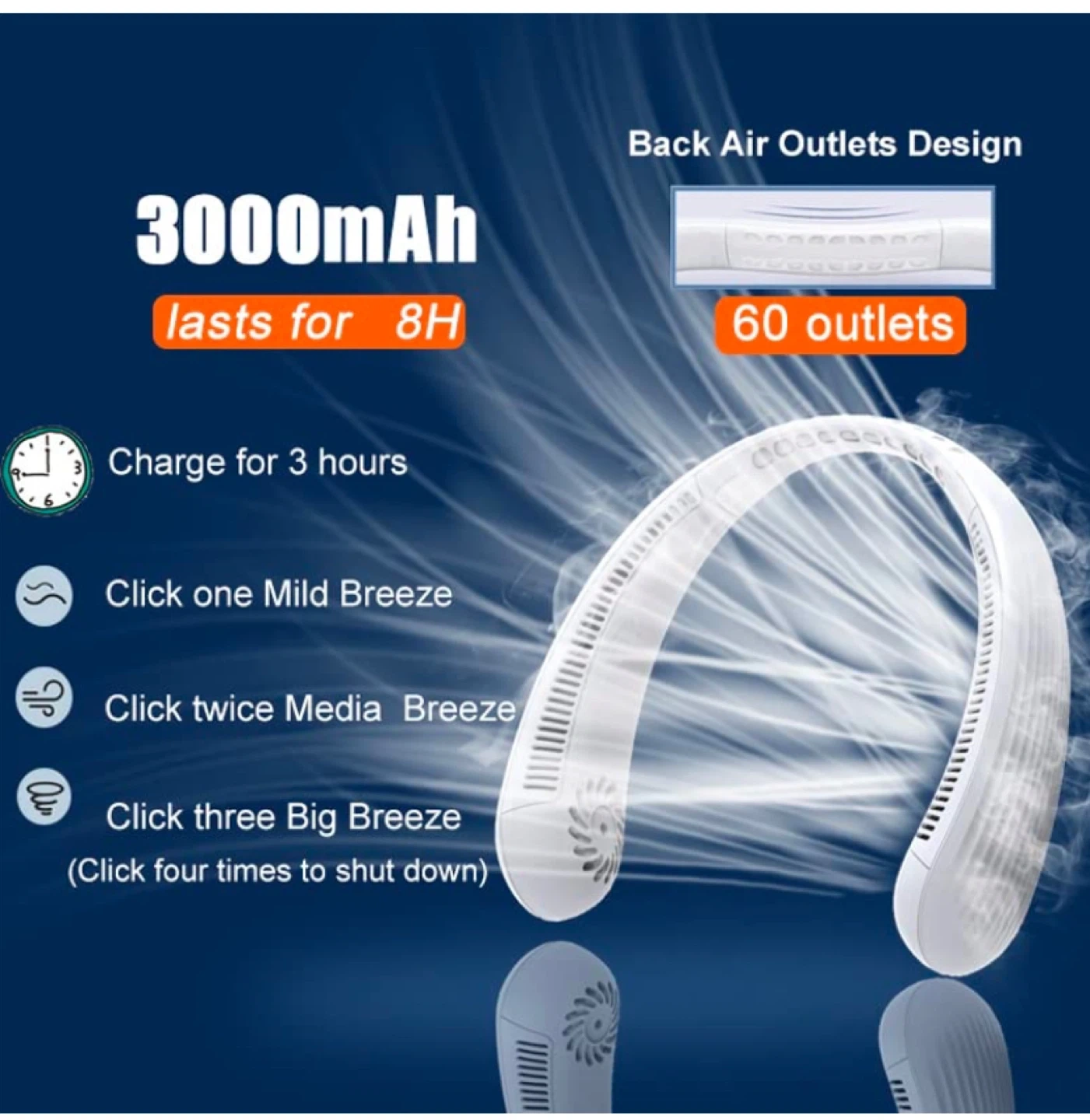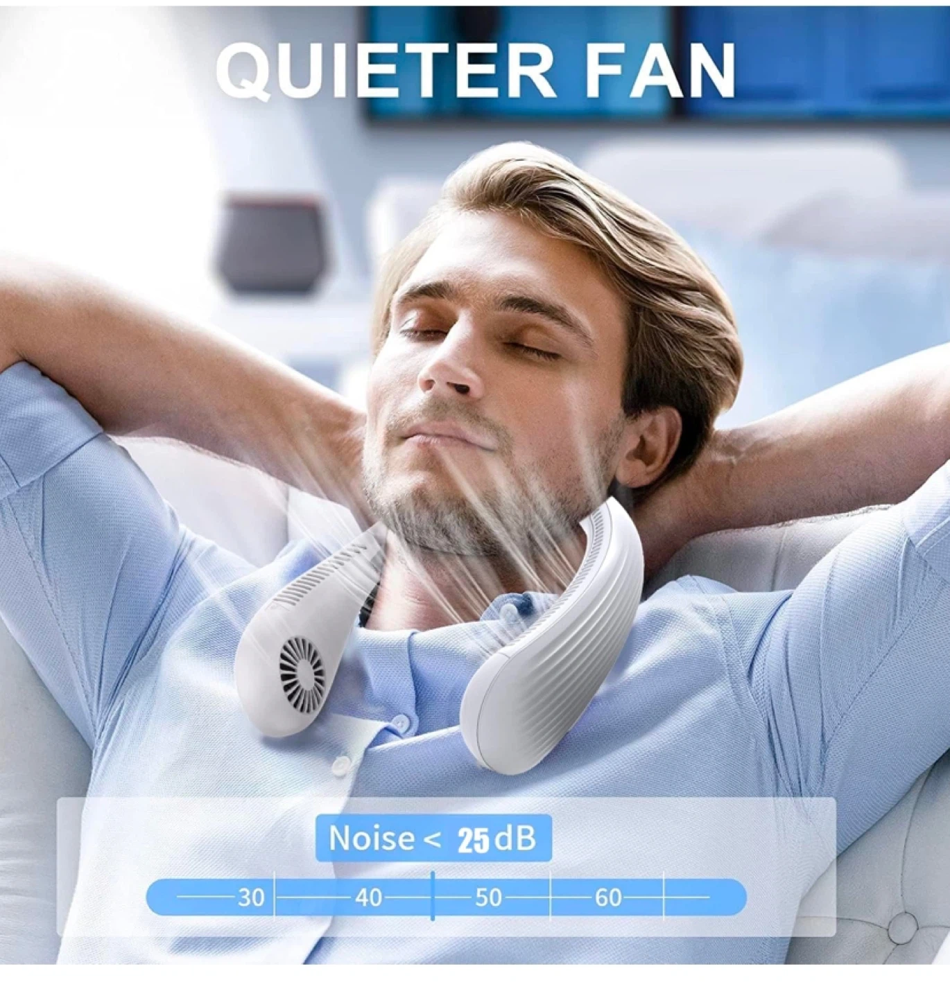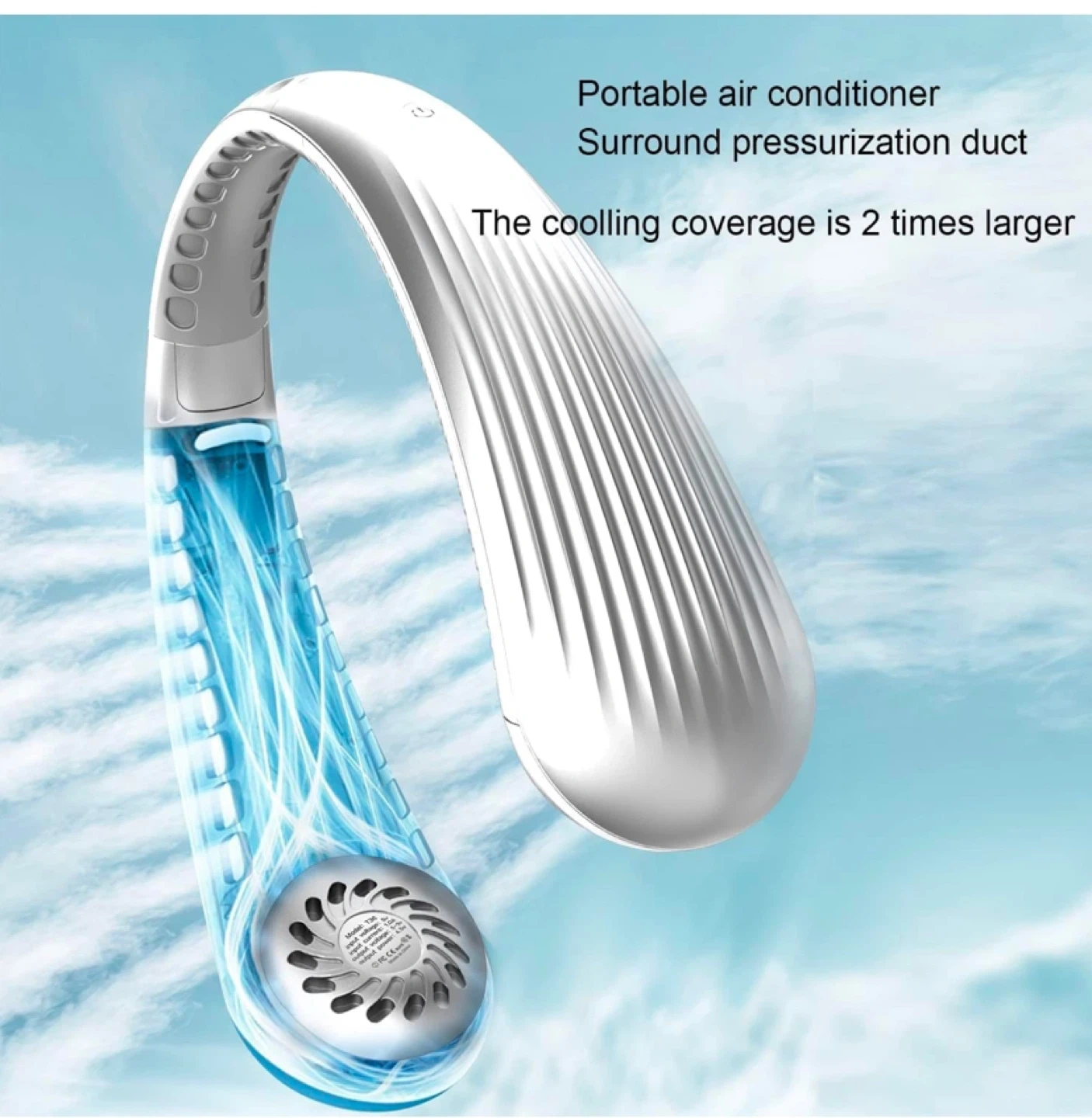 Stay cool on the go with this portable neck fan bladeless 3 speed, featuring a 4000 mah battery for up to 8 hours of use and adjustable airflow settings. This neck fan is brand new. Specifications: * Battery: 4000mah * Usage Time: Up to 8 hours * Airflow: Adjustable settings * Noise Level: Less than 25dB Looking to keep cool this summer, but don't want to be tied to a desk? This neck fan is the perfect solution. It's like a personal AC unit that you can take anywhere. If the ad is still up, then yes, it is still available!