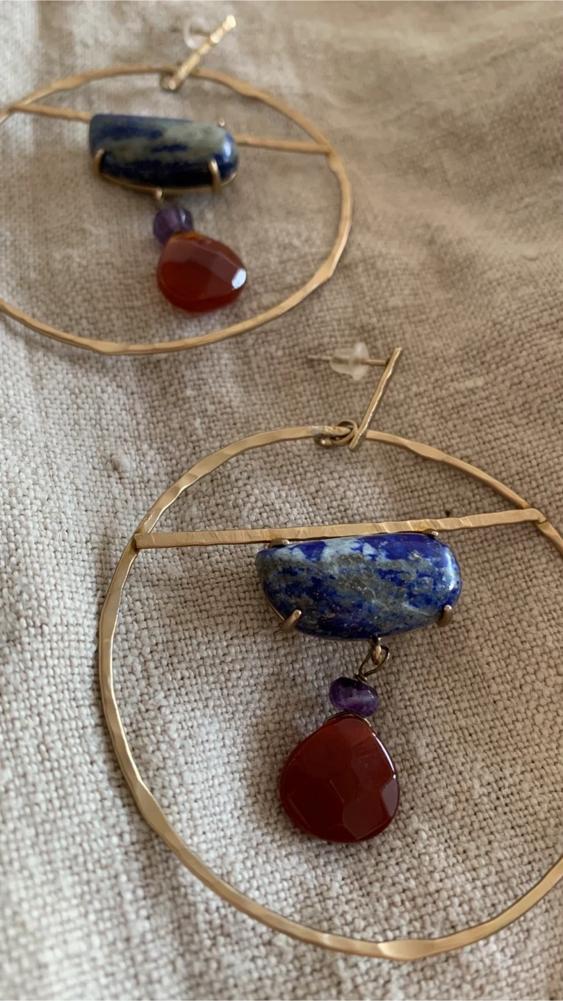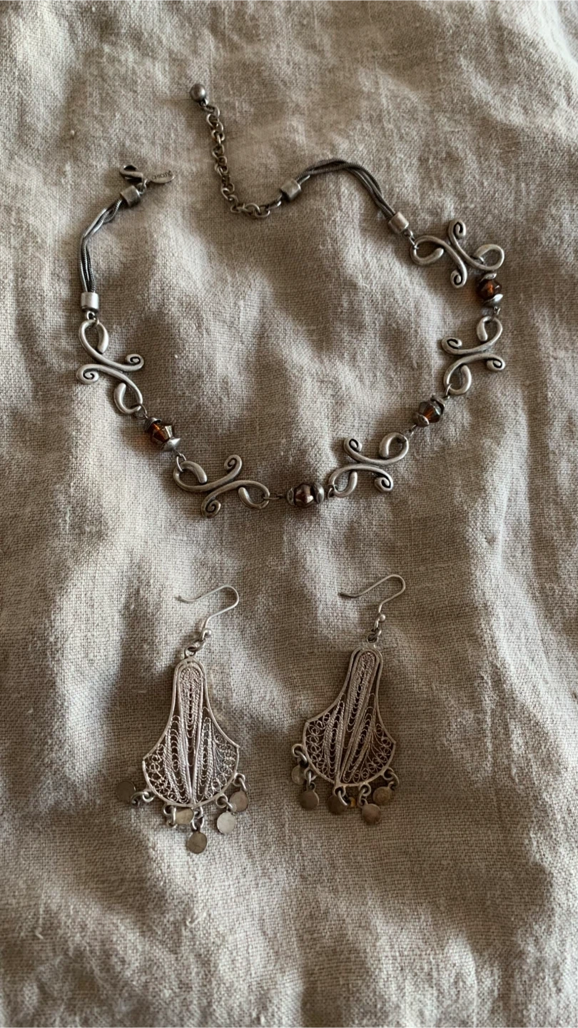 Please inquire for more information if needed. Chico's neckless with iridescent glass beads $9 Vintage Silver earrings $14 Brass earrings with Lapis Lazuli and polished red Jasper $ 24 Blue Sapphire imitation studs on hypoallergenic base comes as a gift with any of purchase.
