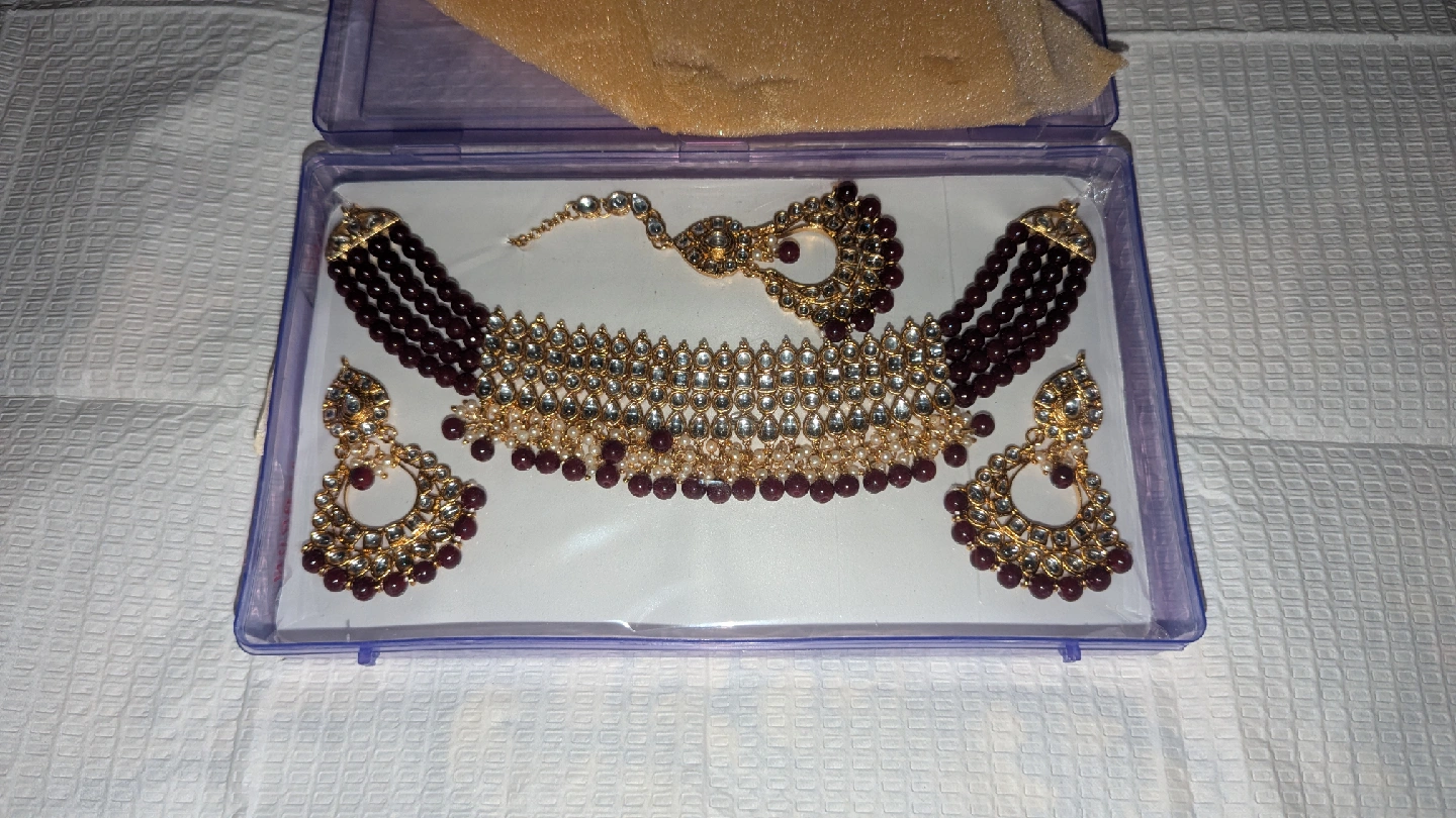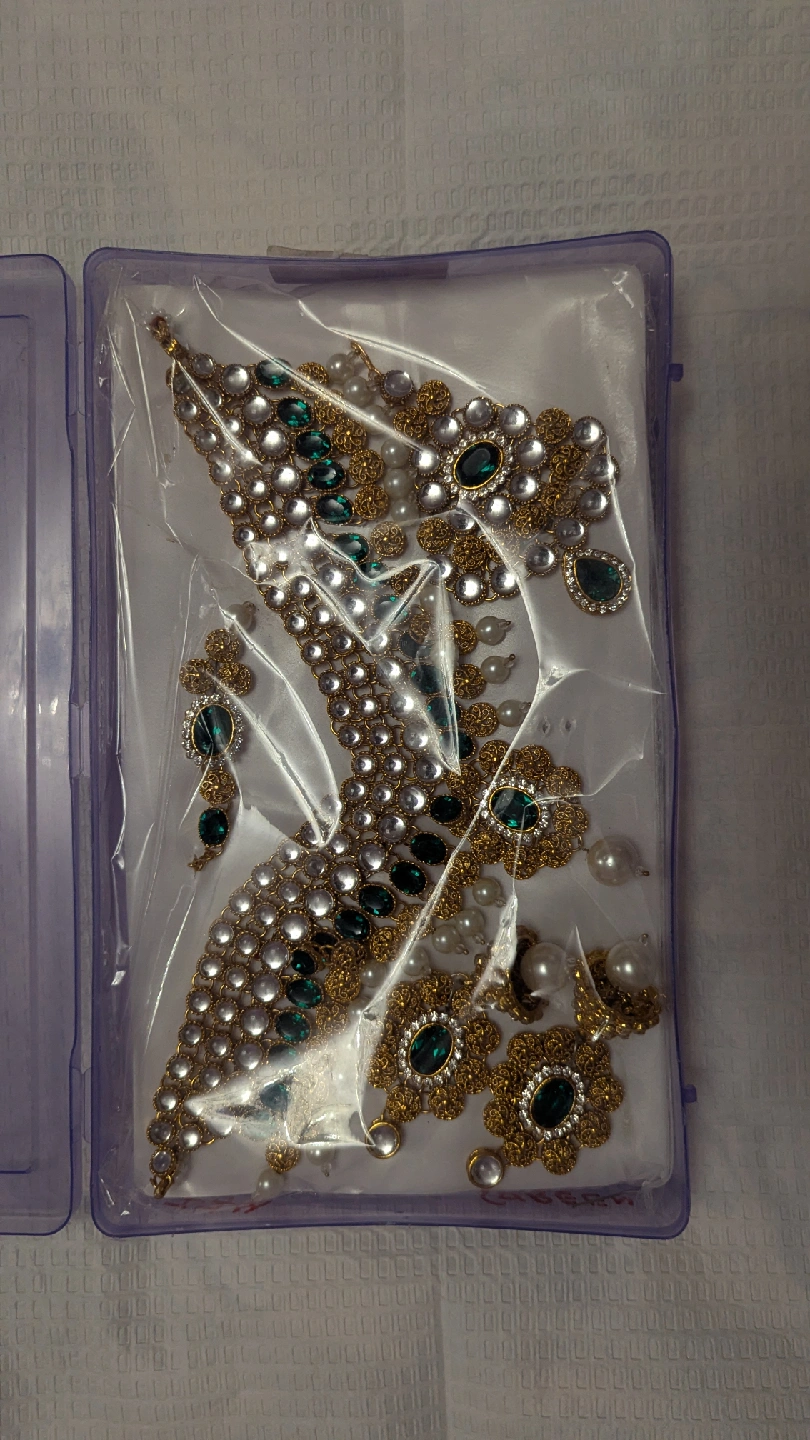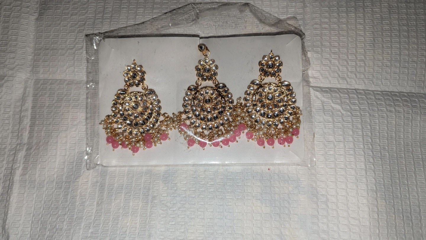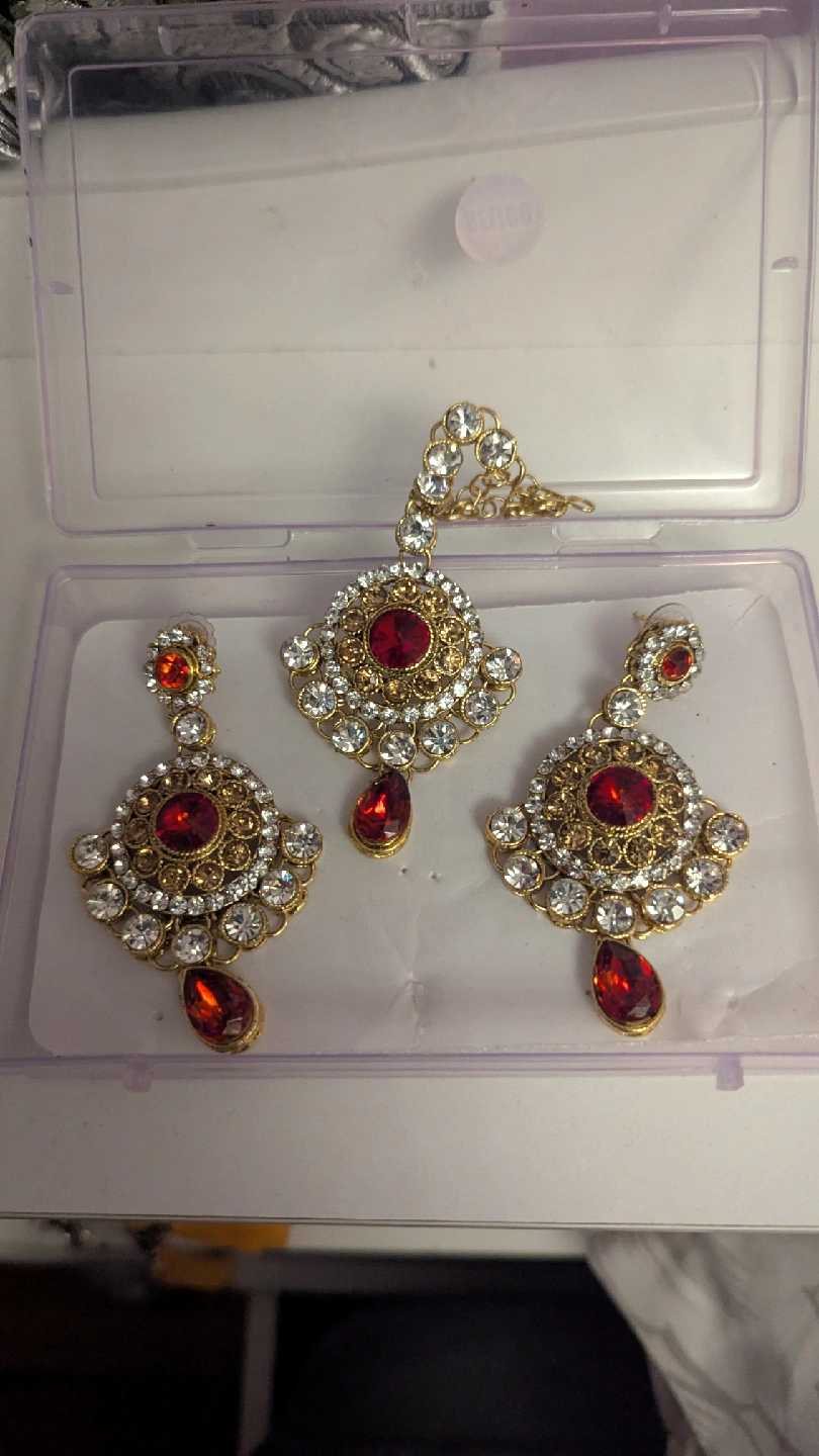 Selling a beautiful necklace and earring set. It comes with a necklace, earrings, and a headpiece. The set is in excellent condition and comes in its original box. Starting at $25. Have plenty more, let me know which color you're interested in