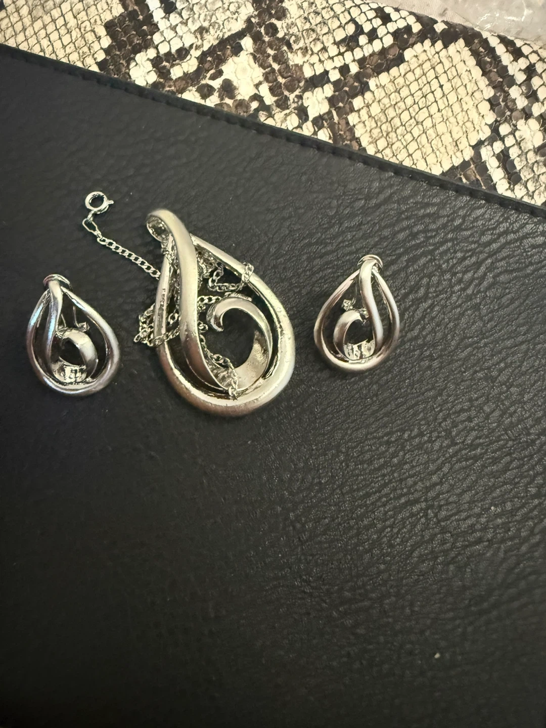 10Selling a lovely necklace and earring set. The set features a matching pendant and earrings with a unique, swirling design. The metal is silver-toned and in great condition!