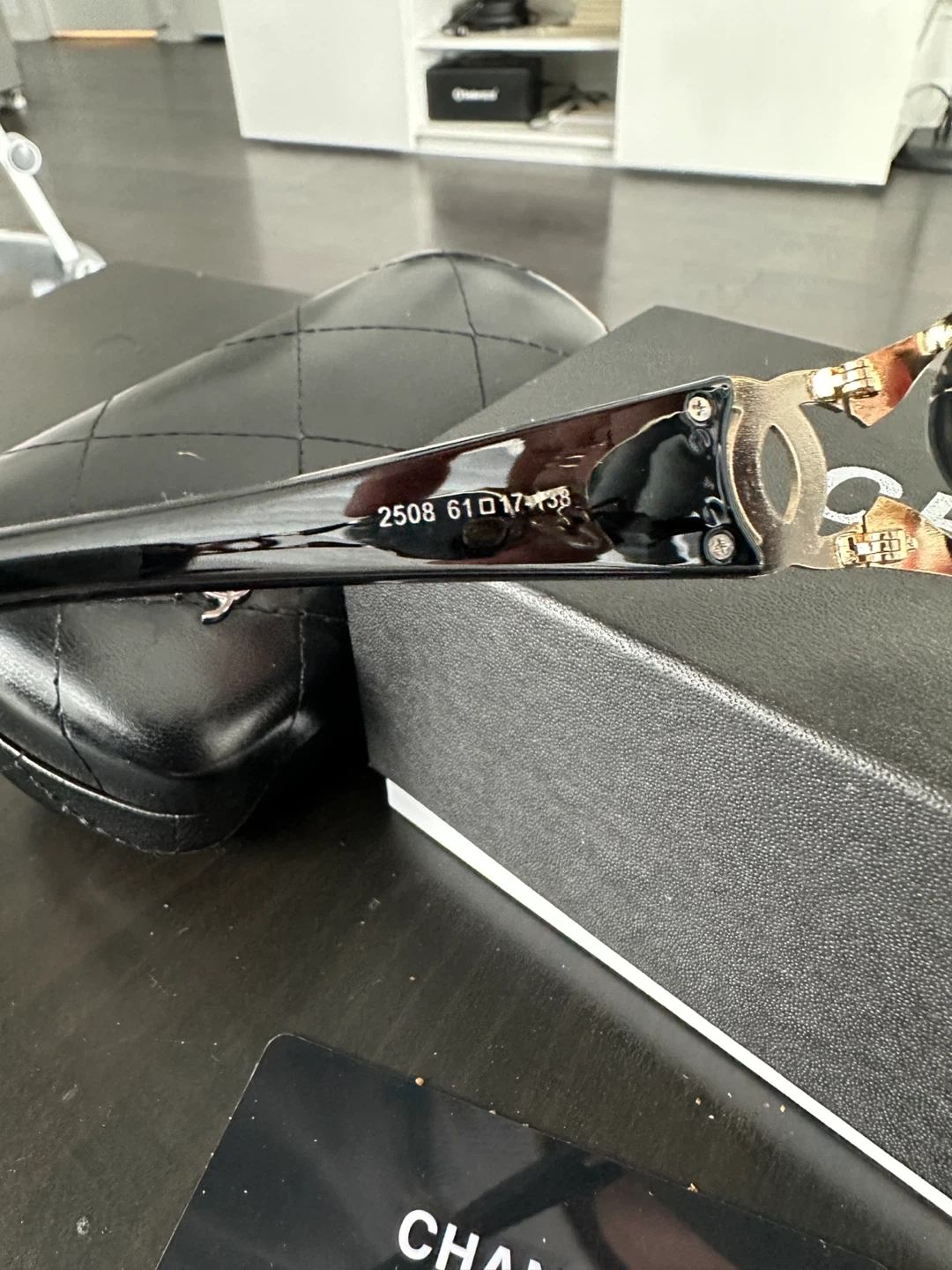 Authentic CHANEL sunglasses in a chic gold and black oval design. They're made in Italy and come with the original box, case, and authenticity card. Protect your eyes in style!