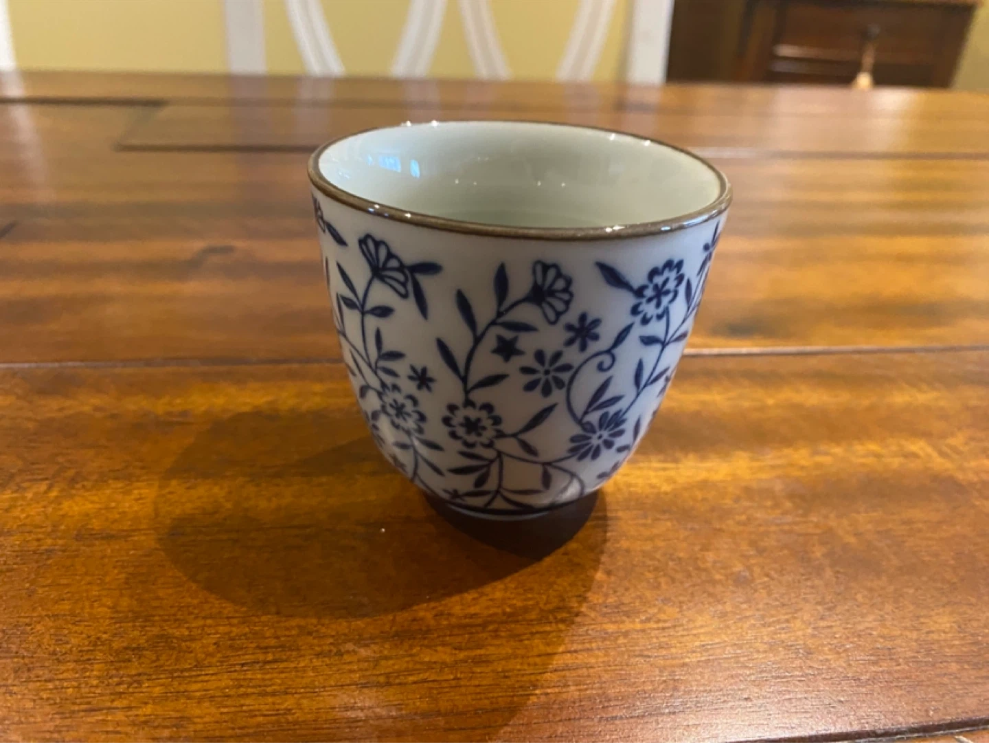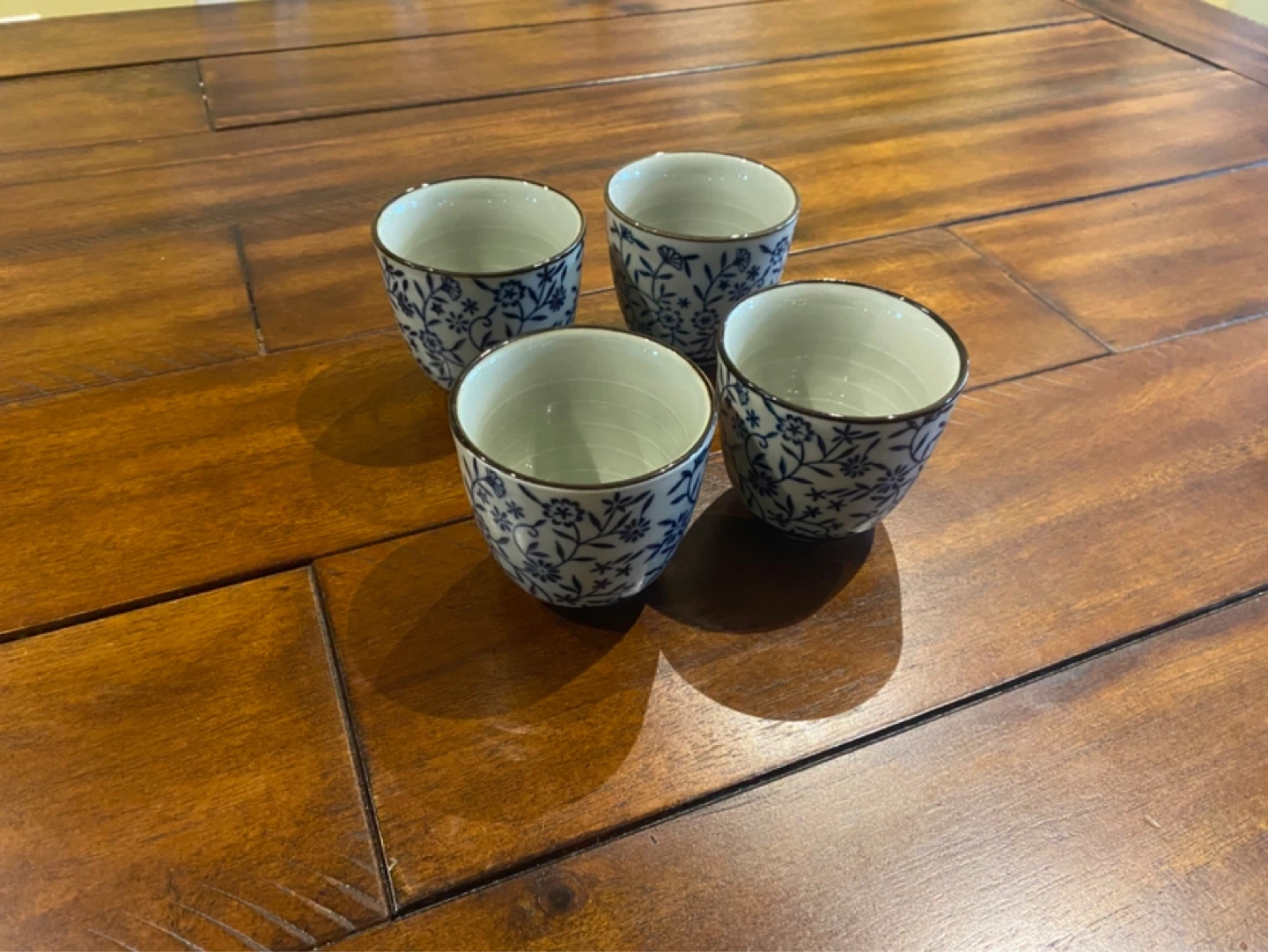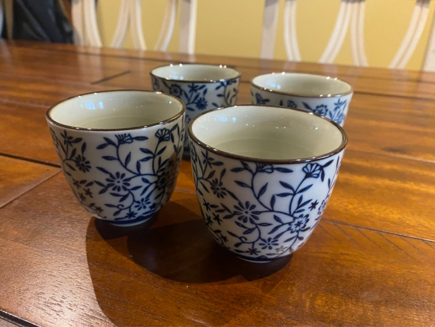 This is a set of four ceramic tea cups featuring a delicate blue floral pattern. They're perfect for enjoying tea or small beverages. Ceramic material.