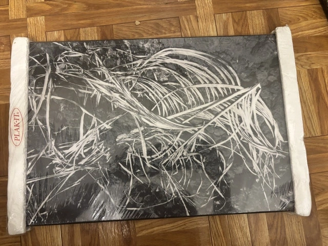 Elevate your space with this striking Plak-It print, showcasing a monochrome botanical design ready to mount and display. This item is new, still sealed in plastic, ensuring it's in pristine condition, perfect for adding a touch of modern elegance to any room.