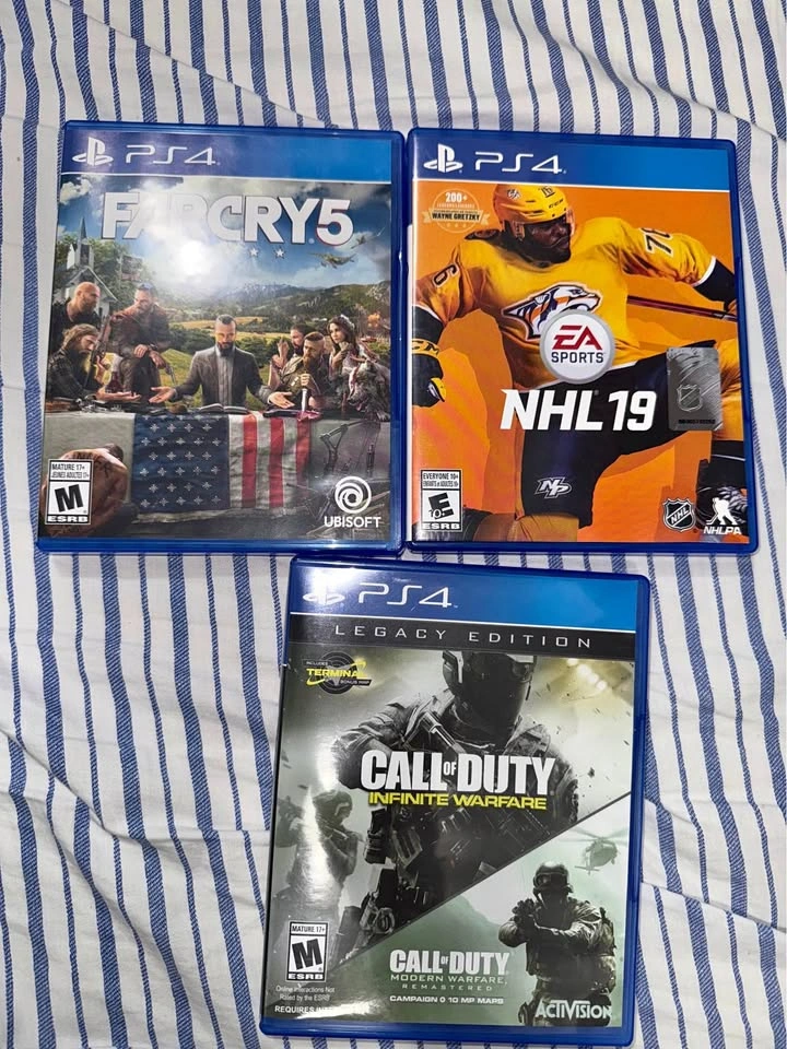 74Selling 3 PS4 games in good condition: • NHL 15 • Far Cry 5 • Call of Duty: Infinite Warfare (Modern Warfare not included – was a one-time online code) $10 each Take all 3 for $30 Pickup near McLaughlin & Steeles