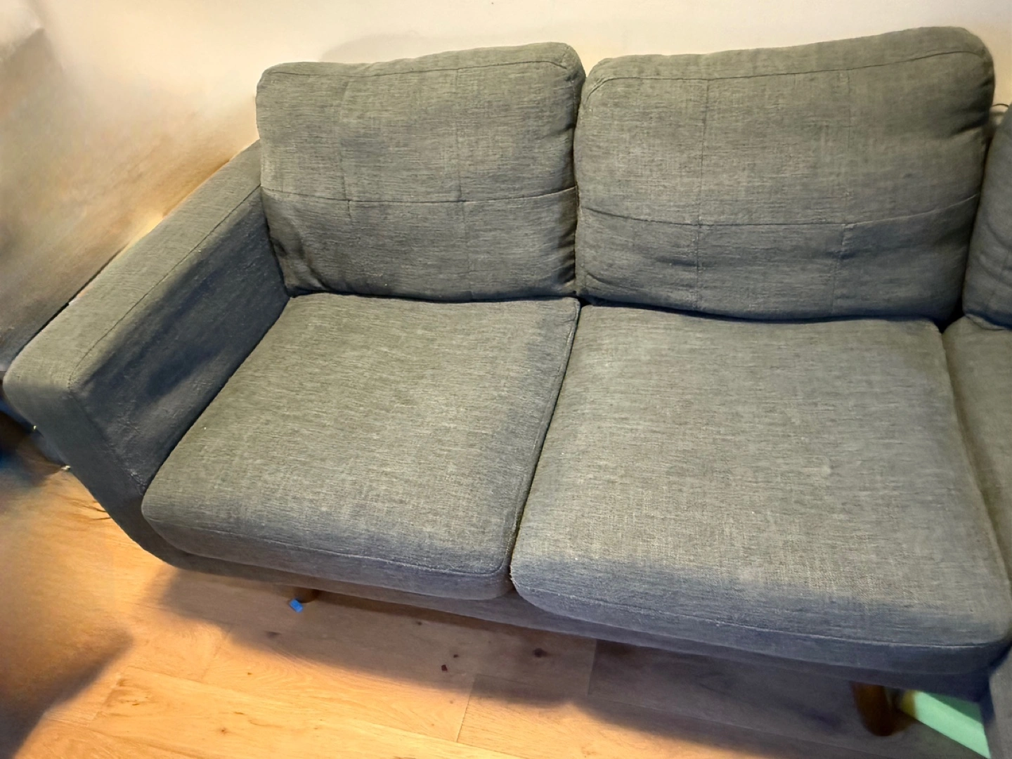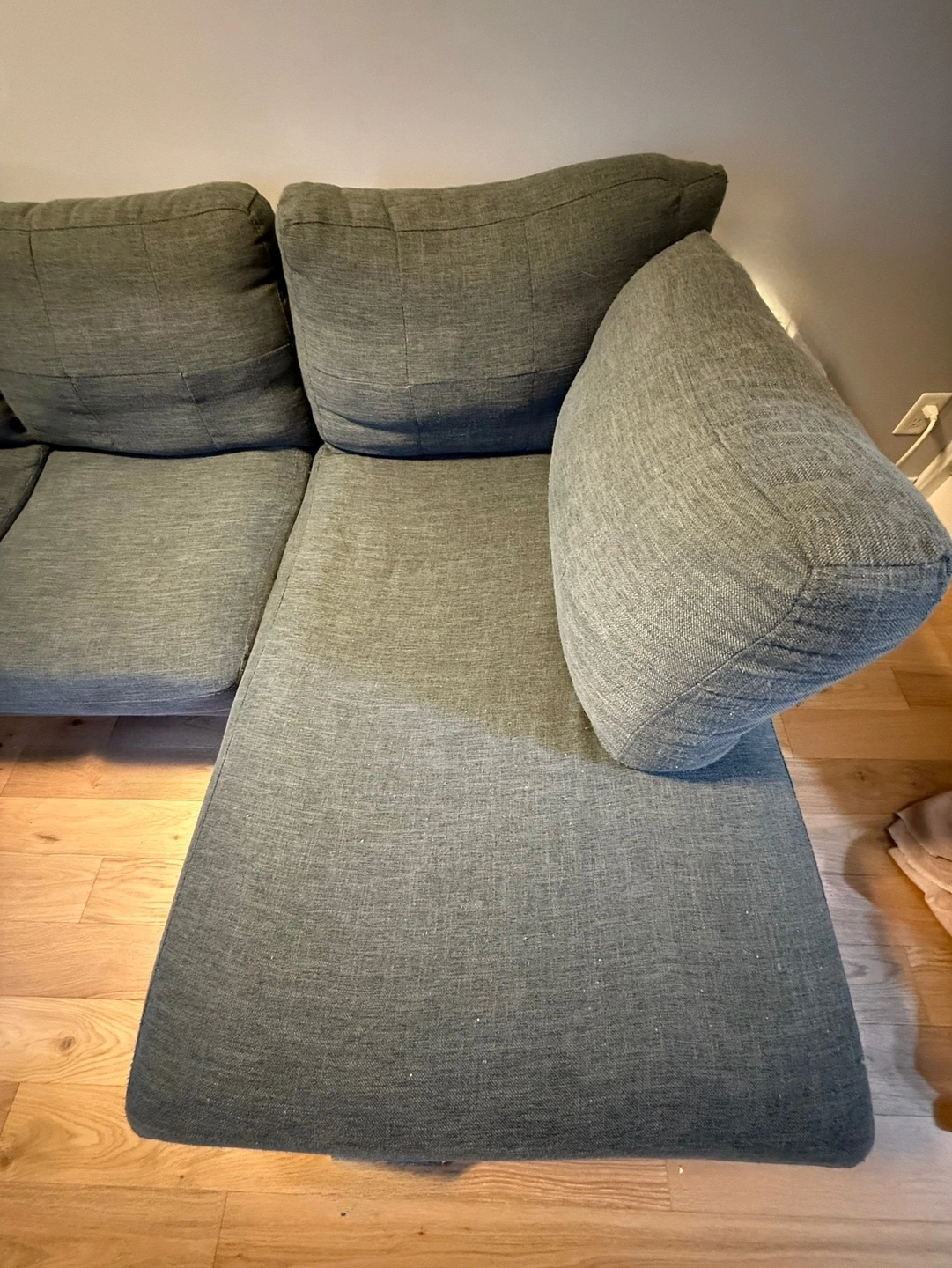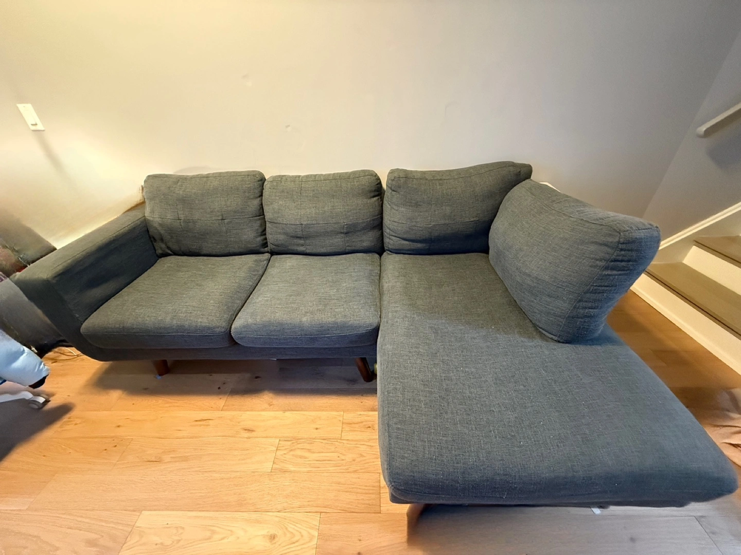 Sectional Sofa "Margot Dark Grey”. It’s in good condition as shown in the pictures. Must go ASAP🚨 The Chaiser per the design is on the left side. Measurements: Depth 80 cm Length 215 cm Height 1 (floor to seat) 44cm Height 2 (floor to arm seat) 63cm Chaiser 135cm In the Last picture the couch is disassembled for easy transport.