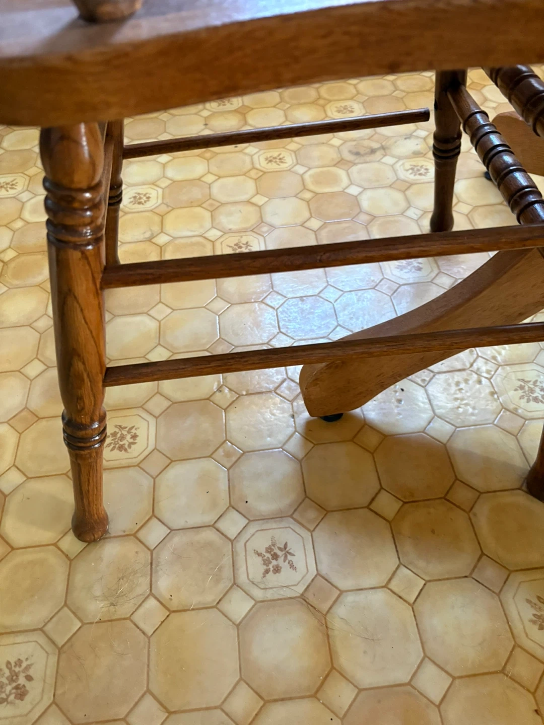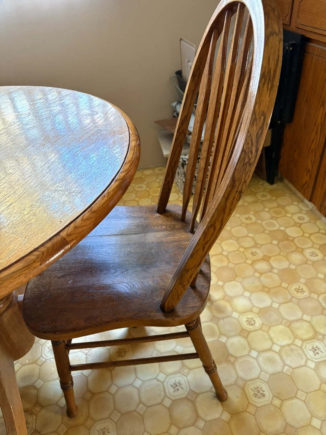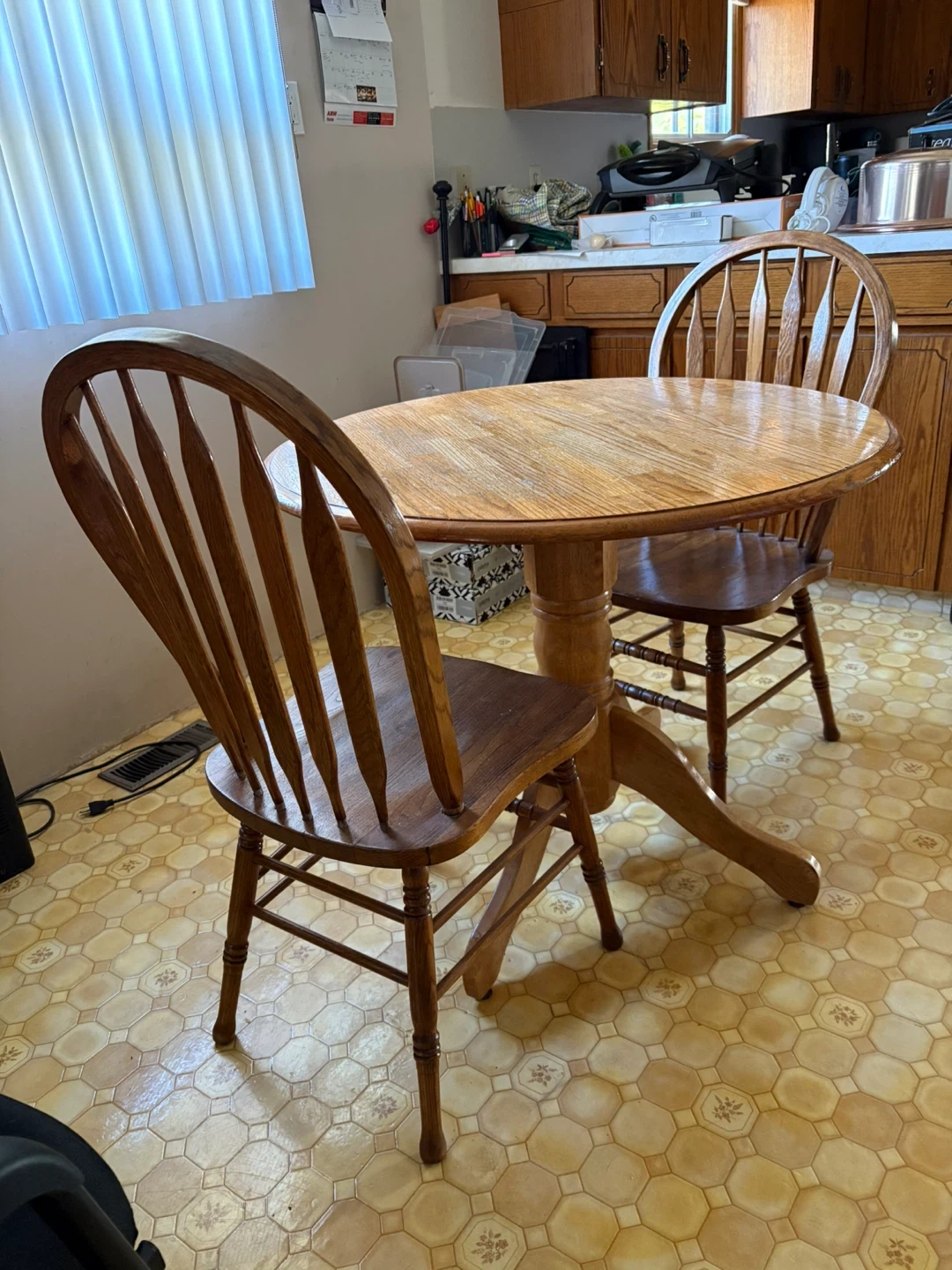 Selling a charming wooden dining table that comes with two matching chairs! The set has a lovely, classic look and is perfect for a small dining area or kitchen nook. The wood has a nice grain and warm tone, adding a touch of rustic elegance to any space. Chairs require some carpentry work and table top could be revarnished