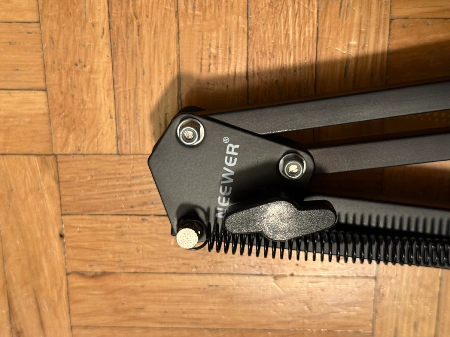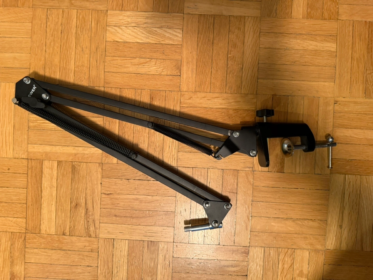 Black microphone boom arm. Includes a heavy-duty clamp for attaching to a desk.