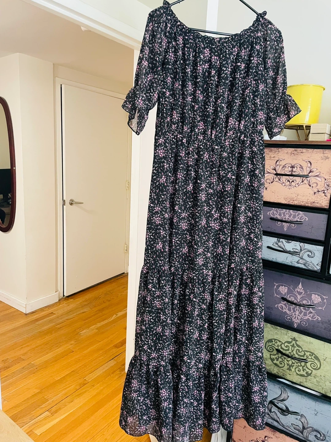 This black maxi dress features a delicate pink floral print and an off-the-shoulder neckline. It has ruffled short sleeves and a tiered skirt for a flowy silhouette. It's made of a lightweight, sheer material.