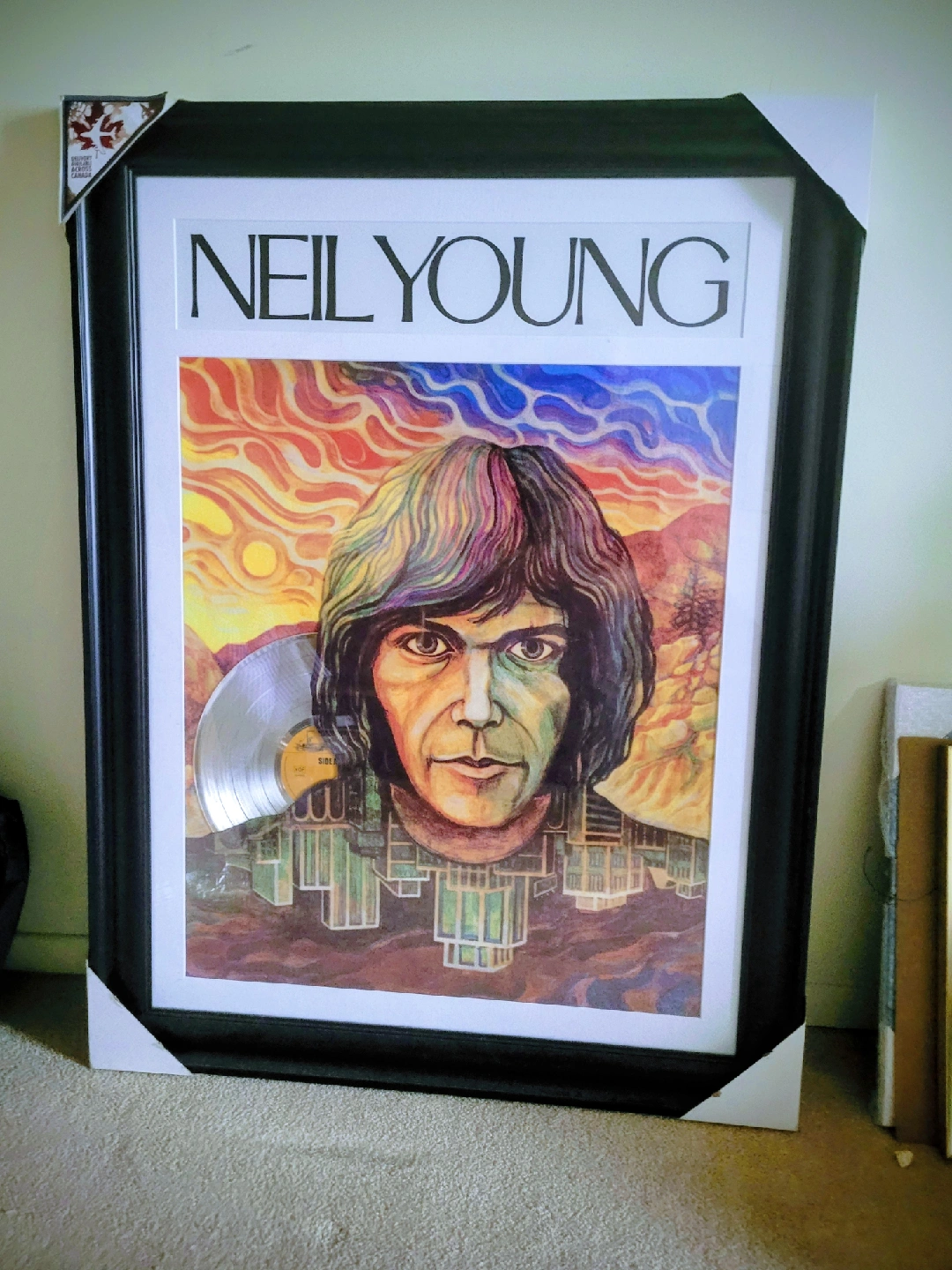 34This framed Neil Young poster is a vibrant tribute that blends music and tells a vistsual story and a bit of Nostalgia! It's framed in class and the size is 39.5 inches across and 42 inches down. I paid $250. for it at a fund raiser and have enjoyed it immensely in my studio. Make me a reasonable offer as the money will go to a good cause.