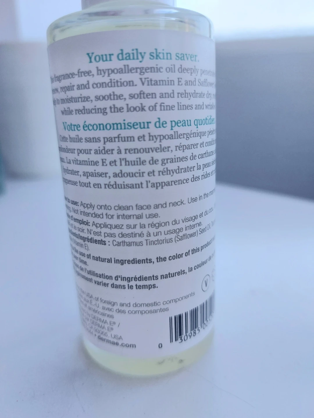 Your daily skin saver, DERMA E Vitamin E Skin Oil deeply penetrates to moisturize, soothe, soften, and rehydrate. It's fragrance-free and hypoallergenic. This oil comes in a 60 mL bottle. Label peeling, but the contents are untouched.