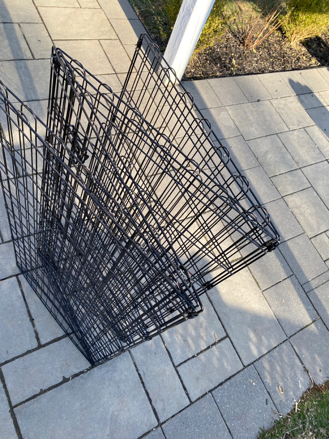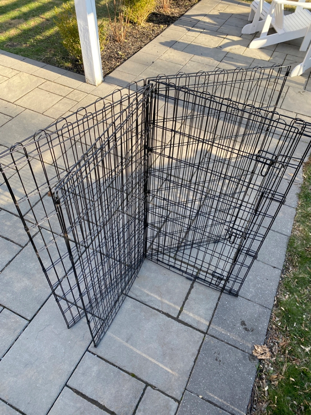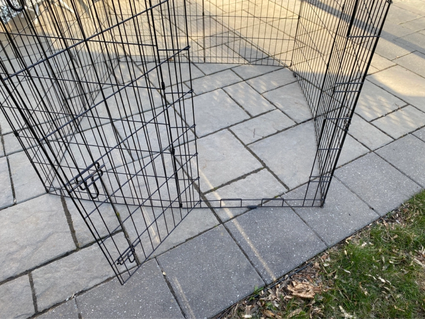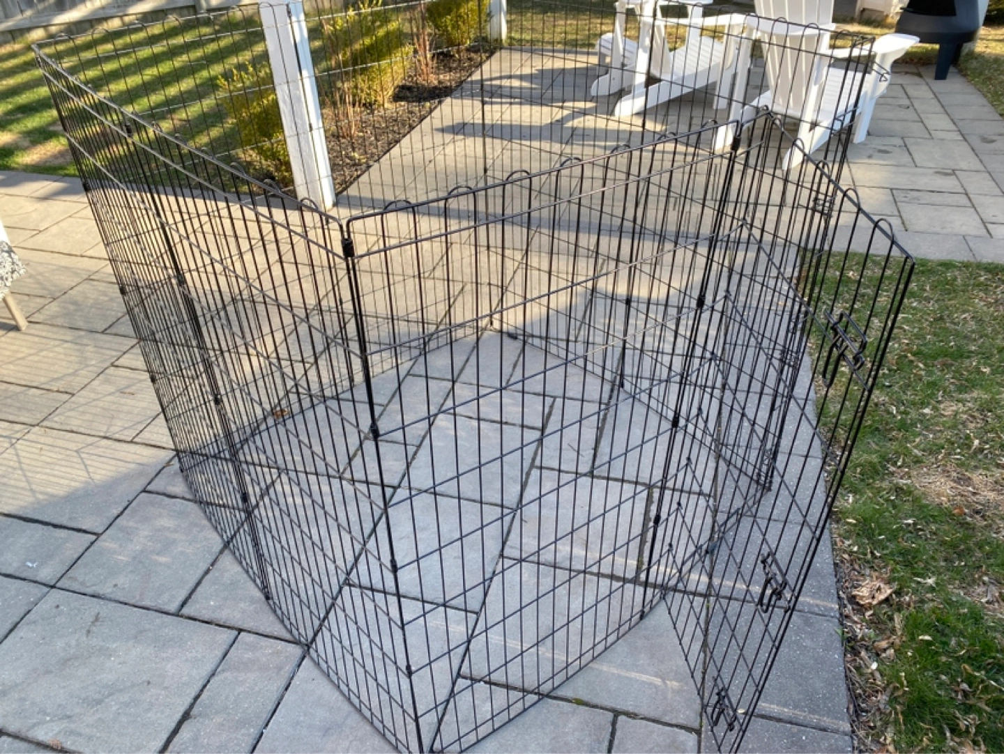 Foldable metal dog pen. 4'x4'x4' Can be set up as a square or octagon. Great for containing pets indoors or outdoors. Easy to assemble and store. Door with latches.