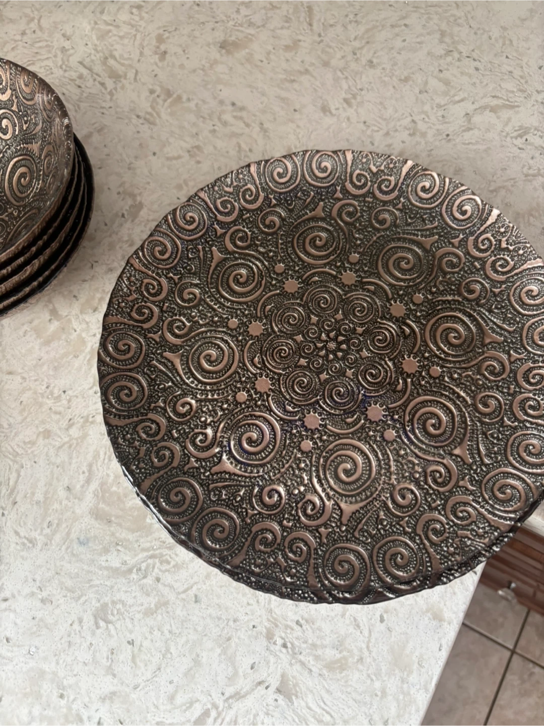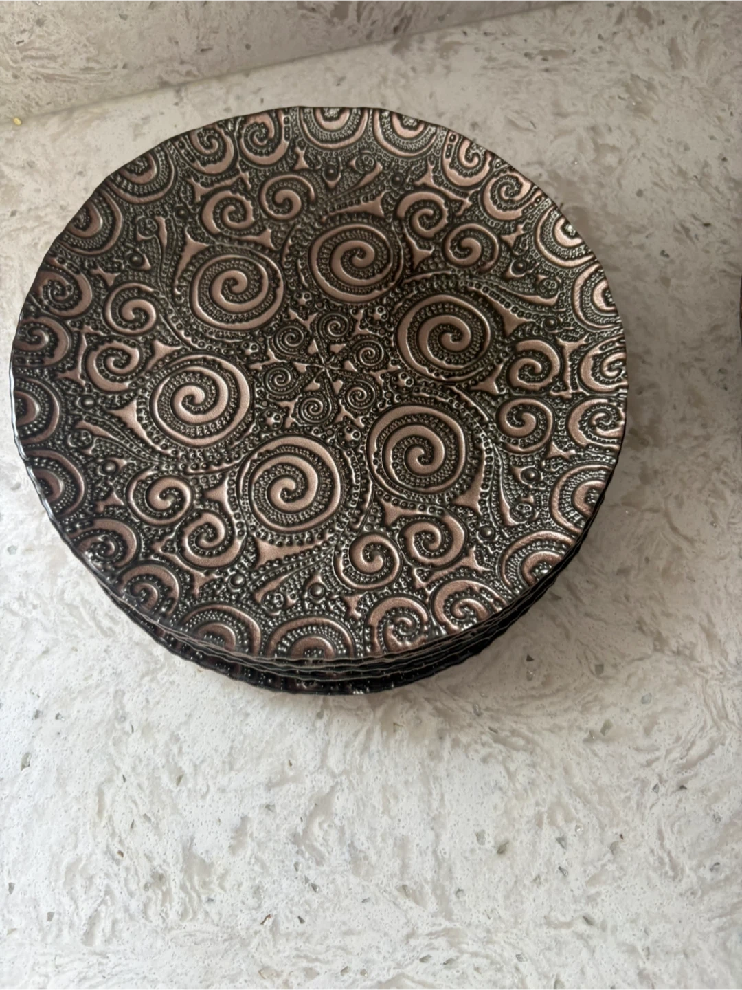 A 5 piece each set of decorative bowls and plates featuring an intricate embossed swirl pattern. This set includes multiple bowls and plates with a coppery bronze finish. They're great for serving snacks or as decorative pieces.