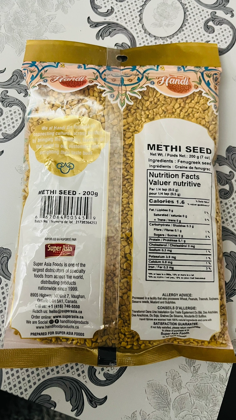 200g bag of Hendi brand Methi (Fenugreek) seed. The bag is sealed and the contents are in good condition.