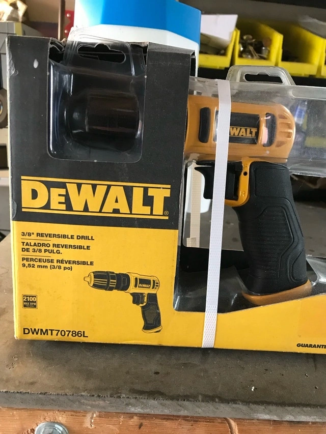 Brand new in box Dewalt 3/8” reversible air powered drill. Features a quick change keyless chuck for easy bit changes and a variable speed trigger for controlled power. The 2100 RPM is great for drilling through tough materials, and the one-hand forward/reverse switch makes adjustments quick and easy. Cash only, please.