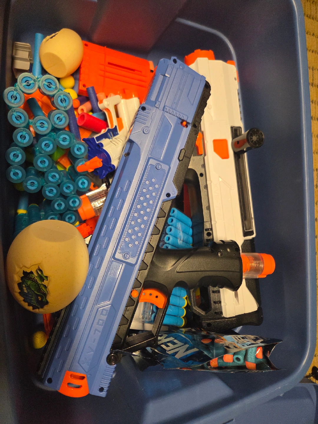 20Selling a collection of Nerf guns and darts. Includes a blue Nerf gun with the text 'XV-700' on it, a white Nerf gun, and a variety of darts and foam balls. Perfect for some fun!