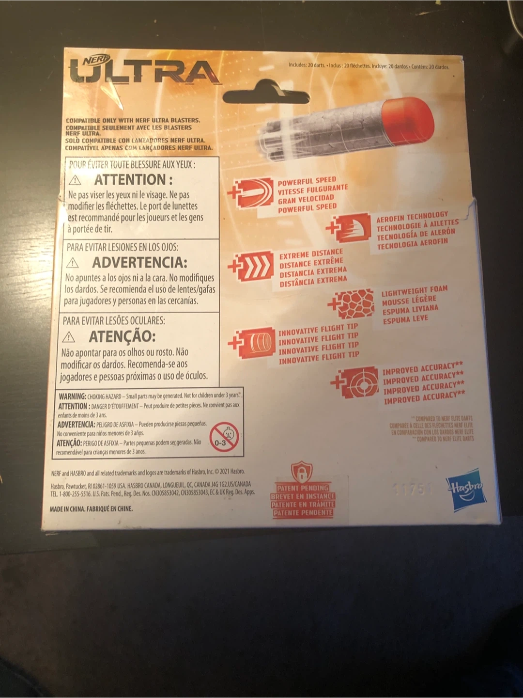 10I'm selling a brand new Nerf Ultra 20-Dart Refill pack! These darts are designed for powerful speed and extreme distance, featuring Aerofin Technology and lightweight foam. They also have an innovative flight tip for improved accuracy. Originally bought for $13.99