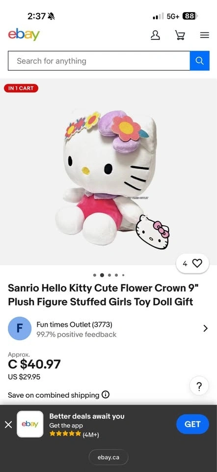 Buy & SellHello Kitty Flower Crown PlushHello Kitty Flower Crown Plush$15New with tags on. Retails for $40, selling for $20.WHERE TO MEETCheck LocationView MapSELLERKendraUpper Jarvis100 reviews0 chats·0 favorites·9 viewsSEND CHAT TO SELLERHi Kendra! I’m interested in your listing.Hi Kendra! I’m interested in your listing.Get the Karrot app to chatSign In to chat