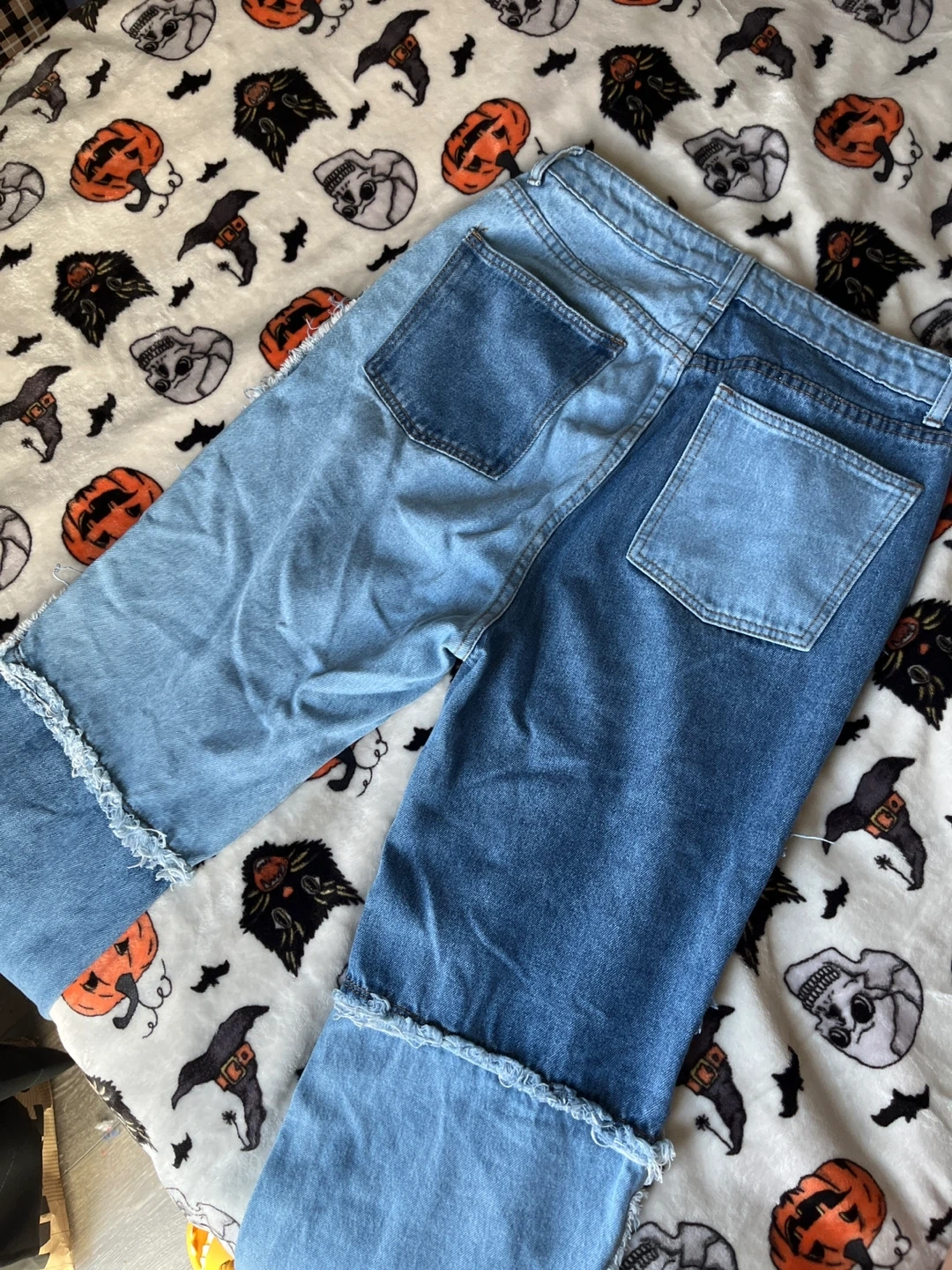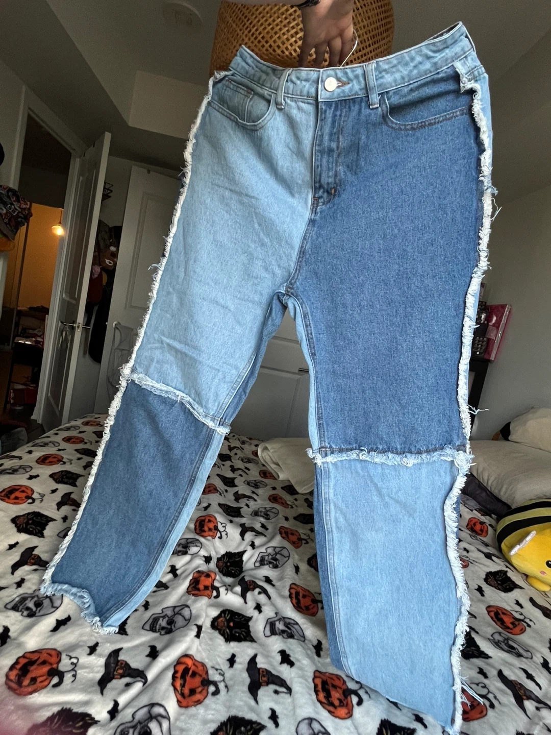 Selling a Shein women's jeans in a unique two-tone design! These jeans are a size medium (7) and feature a cool, patchwork style with different shades of denim.