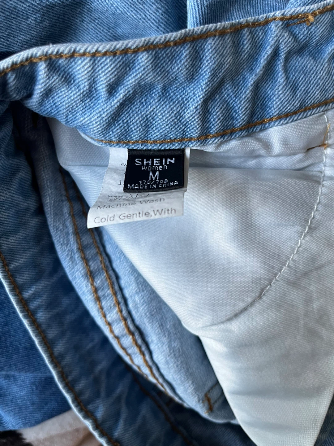 Selling a Shein women's jeans in a unique two-tone design! These jeans are a size medium (7) and feature a cool, patchwork style with different shades of denim.