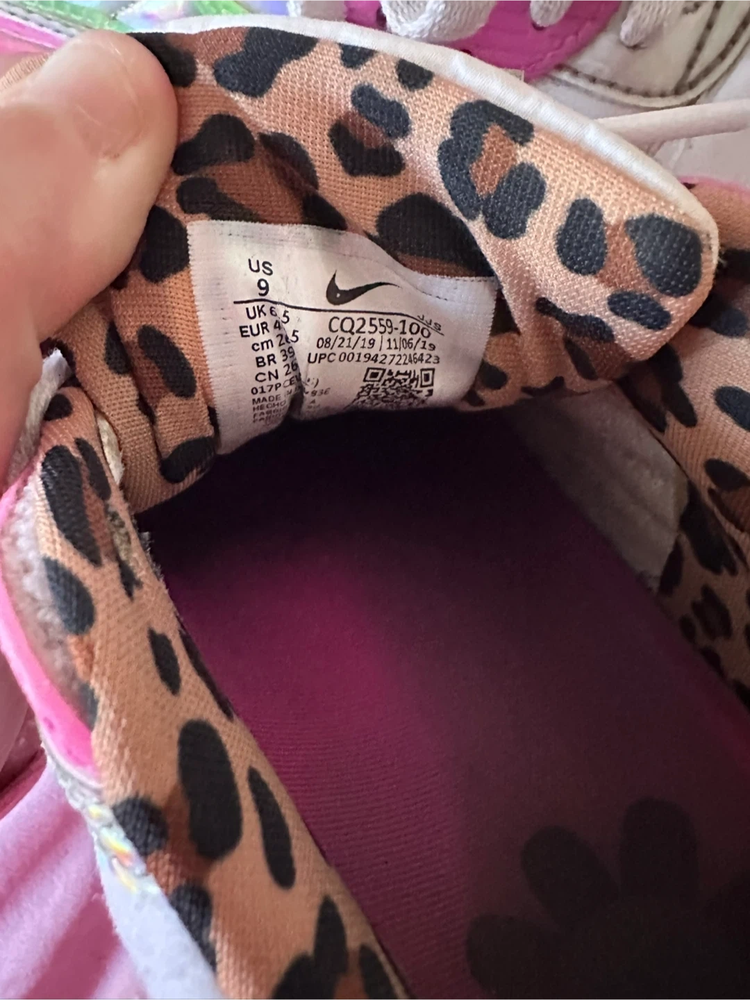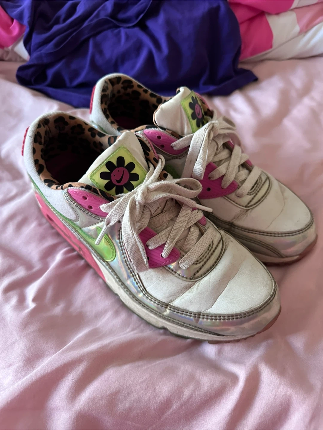 They have a unique design with a leopard print interior and a fun floral accent. They show signs of wear but still have lots of life left!