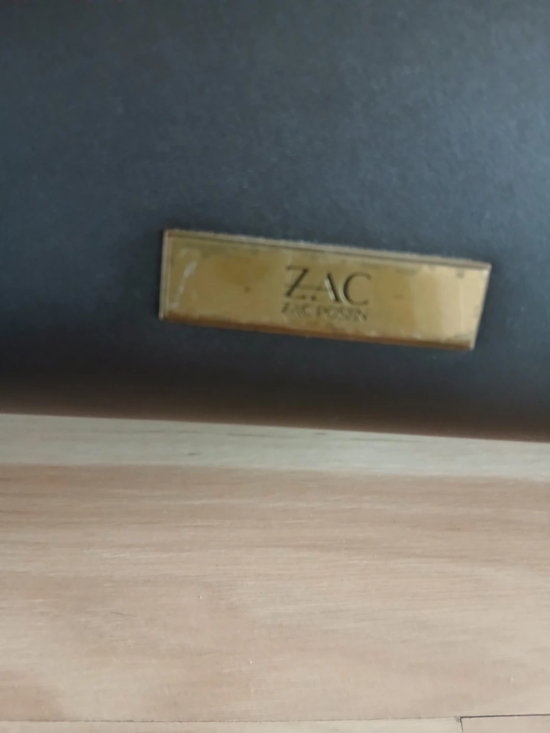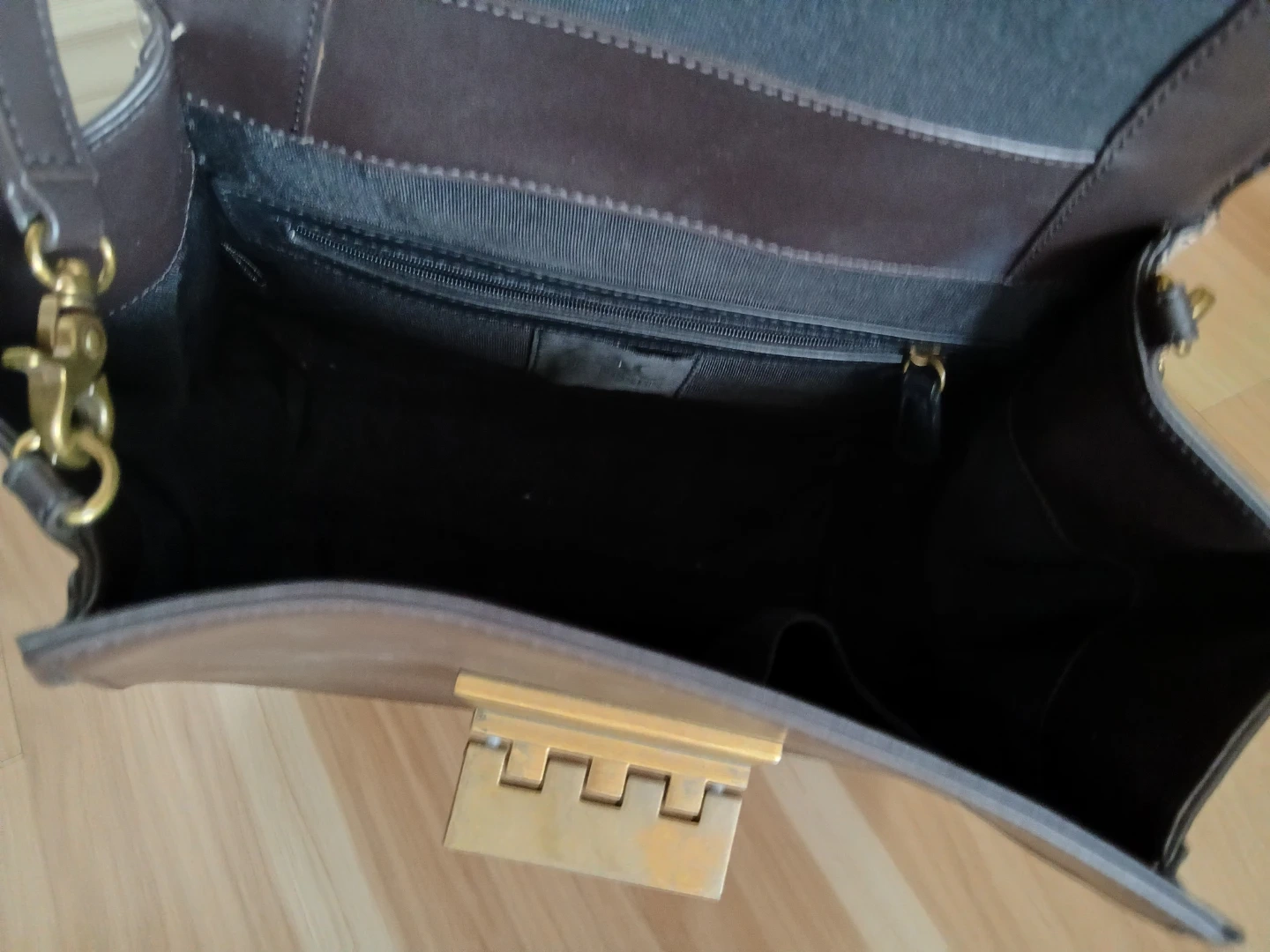 This is a Zac Posen satchel handbag. It's made of leather and features a black and tan colour combination. The bag has a secure clasp closure.