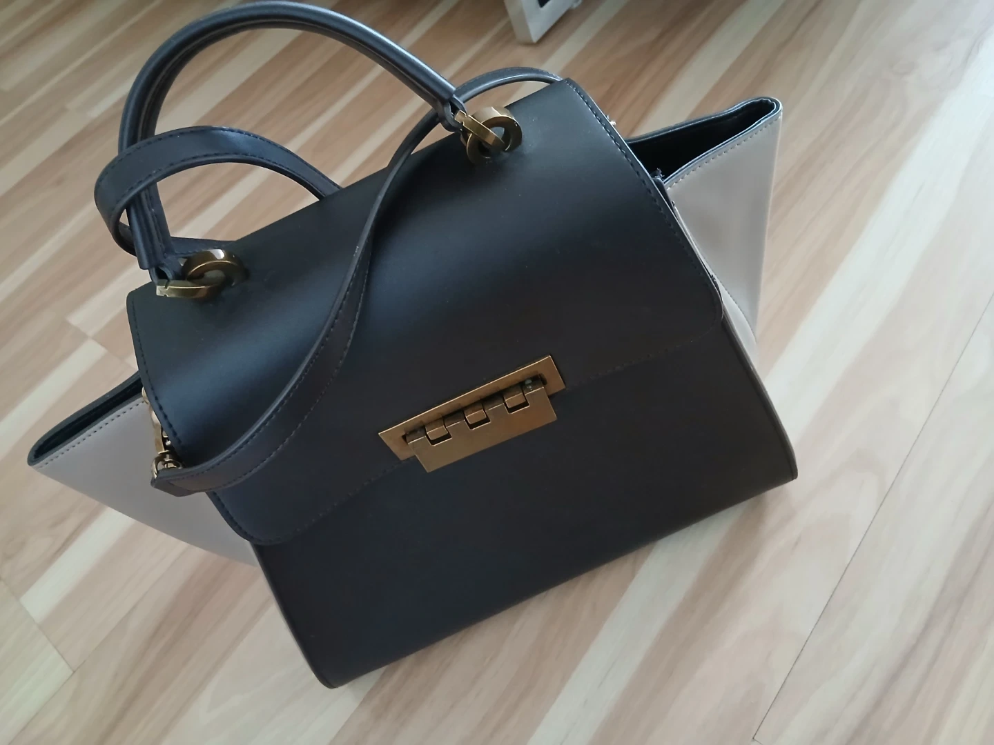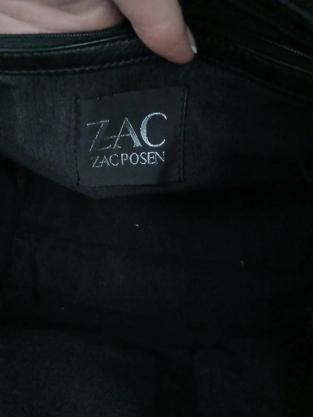 This is a Zac Posen satchel handbag. It's made of leather and features a black and tan colour combination. The bag has a secure clasp closure.