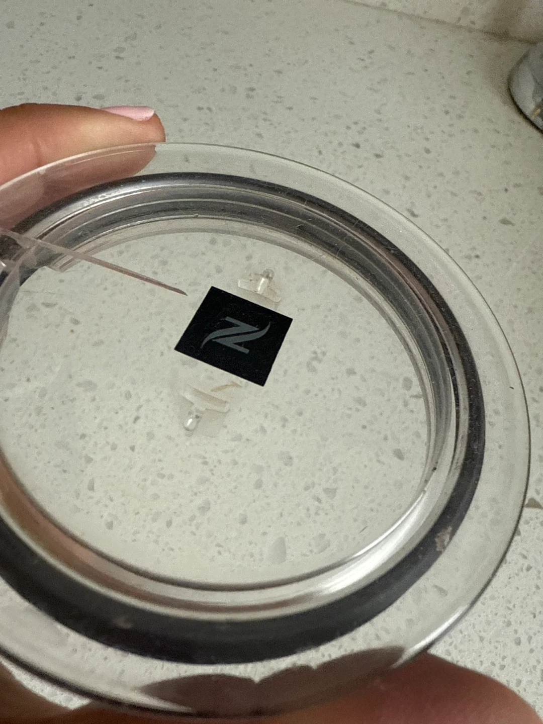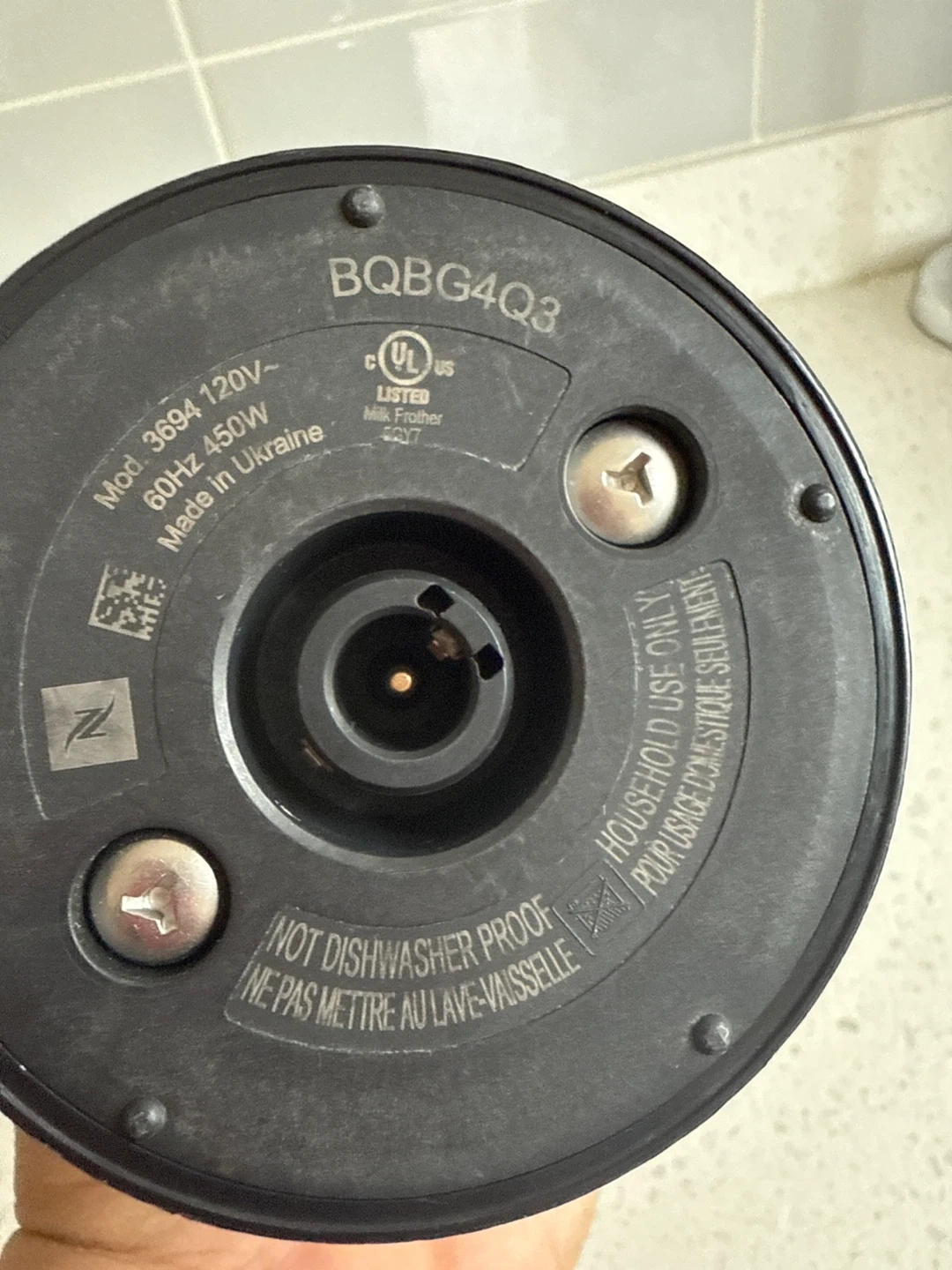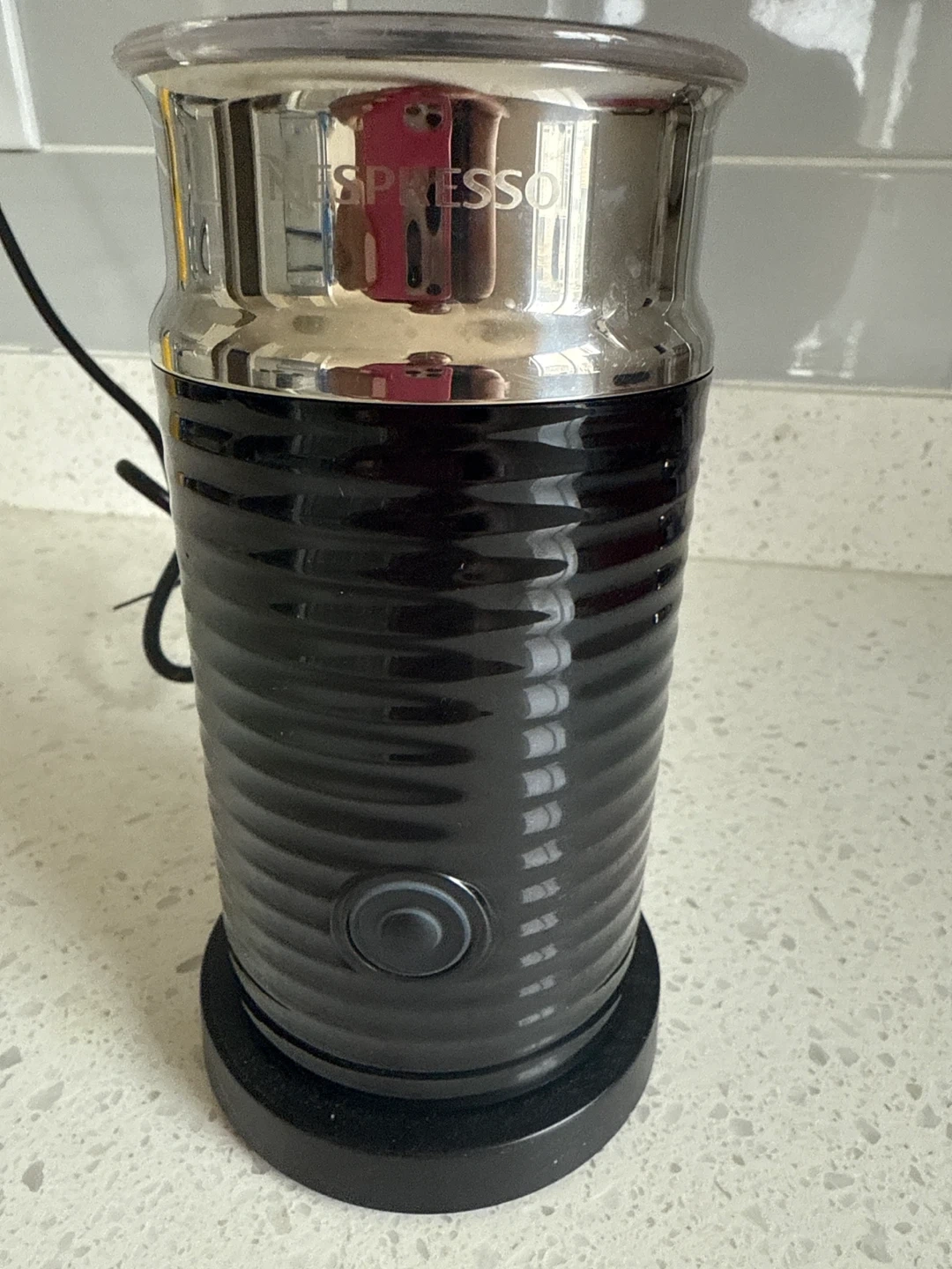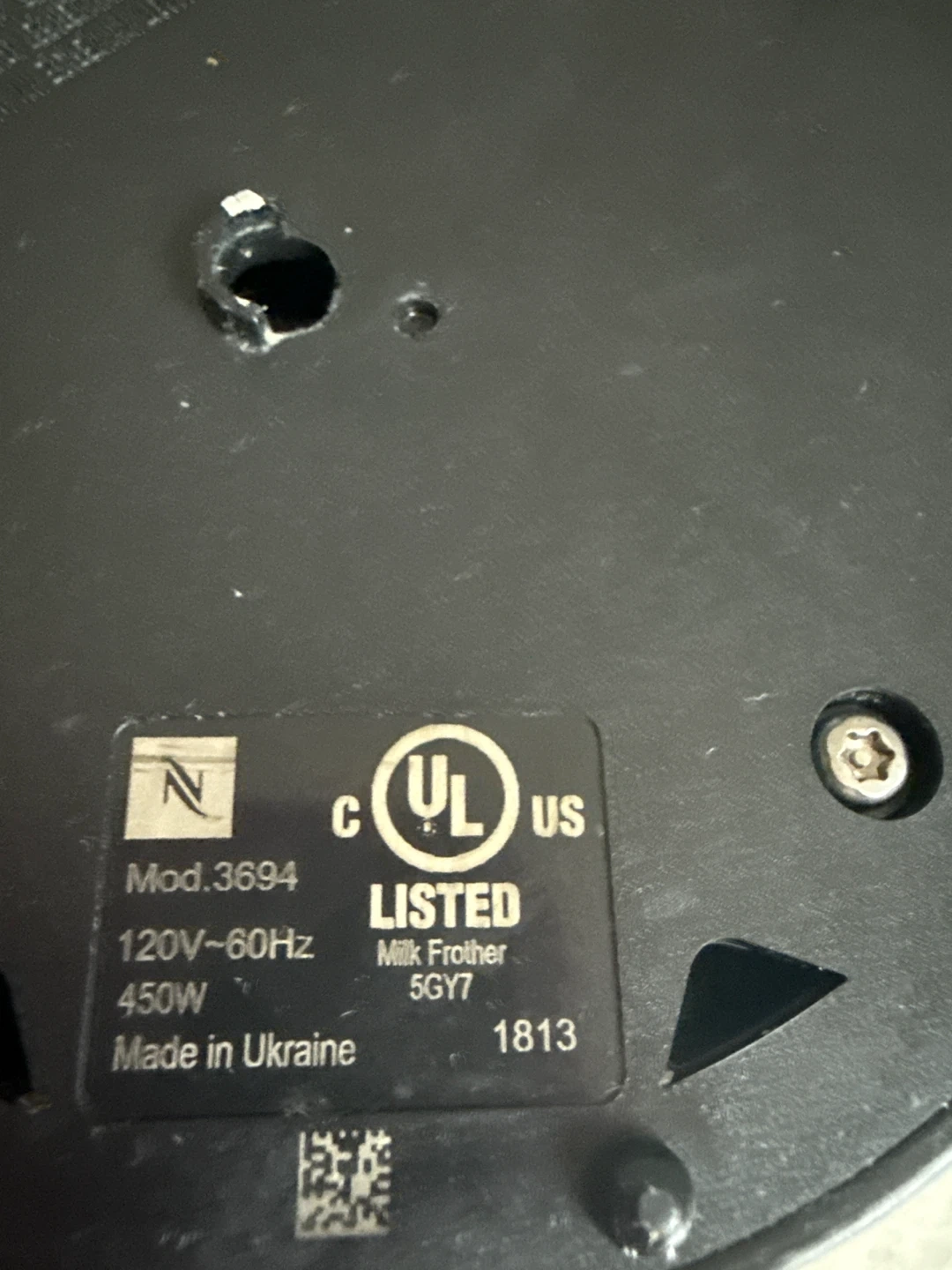 65Selling a Nespresso Aeroccino 3 milk frother in black. It's in great condition and ready to make your coffee extra special! The model number is 3694. It operates at 120V-60Hz and 450W, and it was made in Ukraine. The lid has a crack as seen in the picture but everything works perfectly!