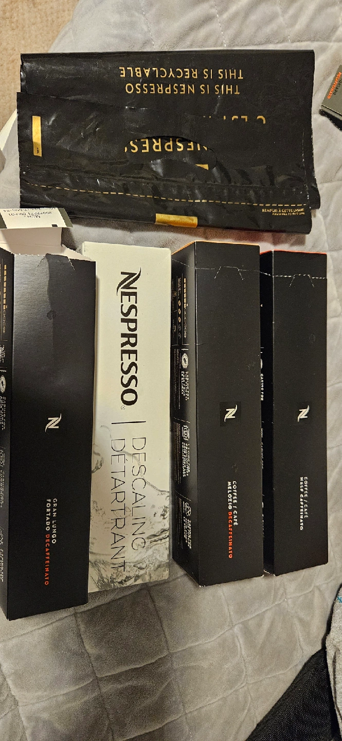 Selling a mix of Nespresso capsules, including Gran Lungo Fortado Decaffeinato, Coffee Melozio Decaffeinato, and Coffee Half Caffeinato. Also included is a Nespresso descaling solution. Perfect for keeping your machine in tip-top shape and enjoying a variety of coffee flavours!