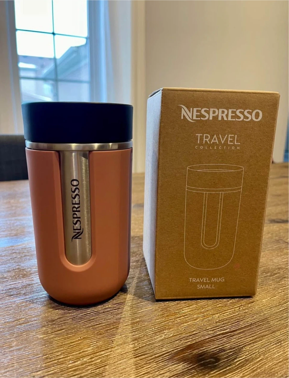 10Selling a Nespresso Travel Mug from the Travel Collection in a small size and peach colour. It's in like-new condition and comes with the original box!
