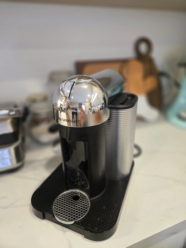 12Pre-owned Nespresso Vertuo coffee machine. Black and silver colour. Works perfectly.