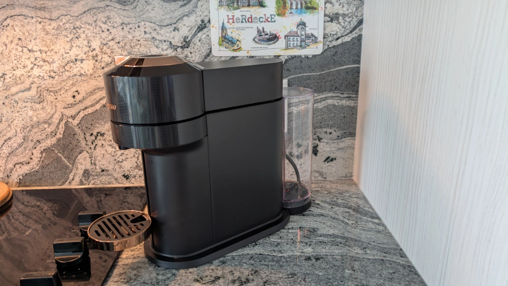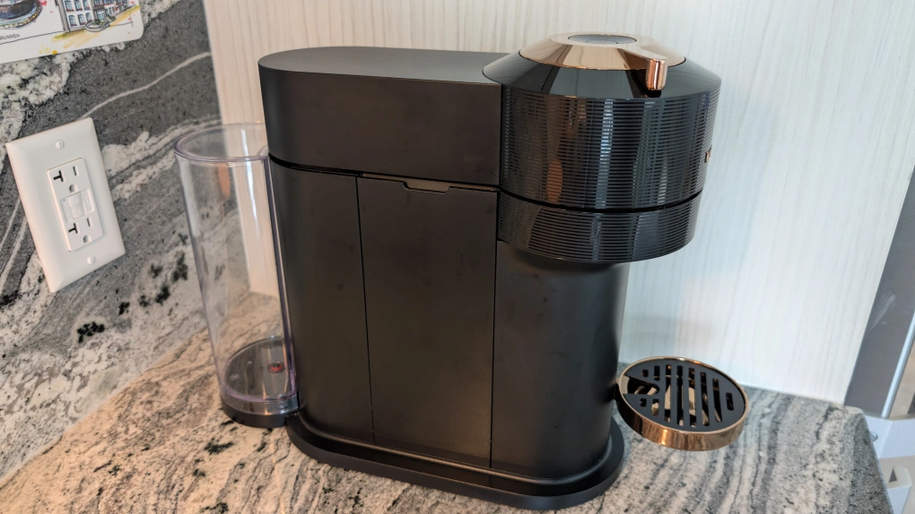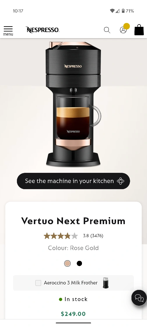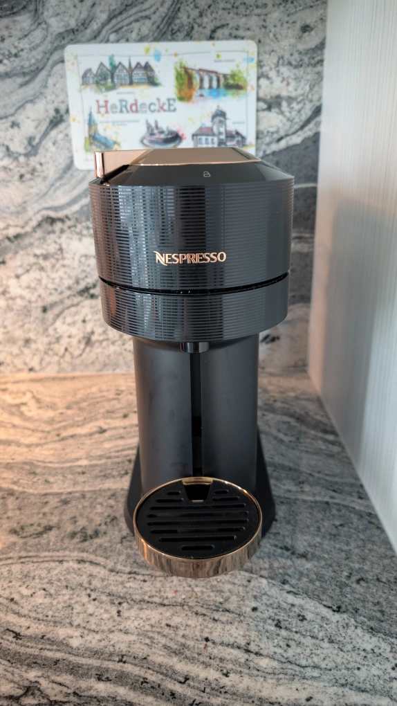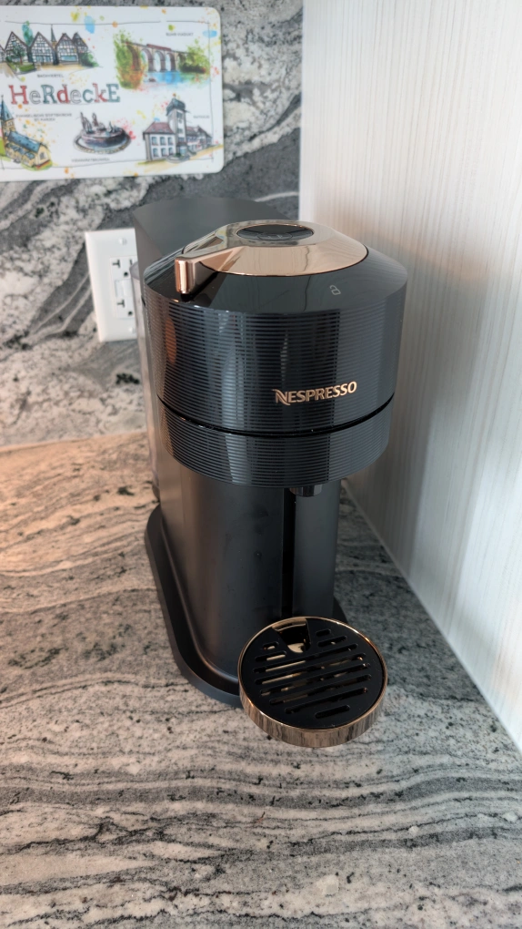 A lovely coffee maker with a sleek black design. Features a rose gold accent. Includes a water reservoir. Making a delicious coffee can ease your stress and let you enjoy a moment to yourself. original price $249