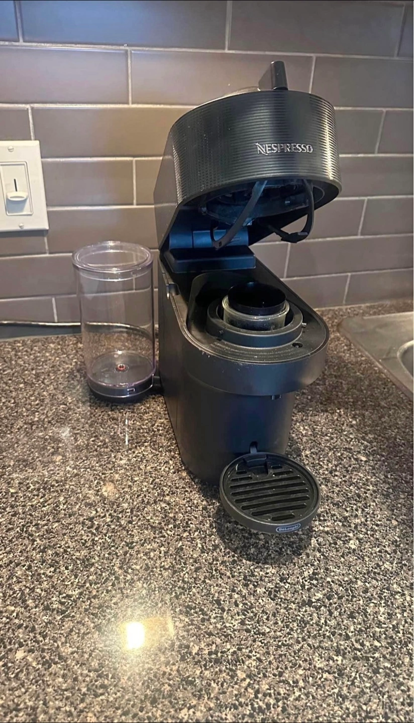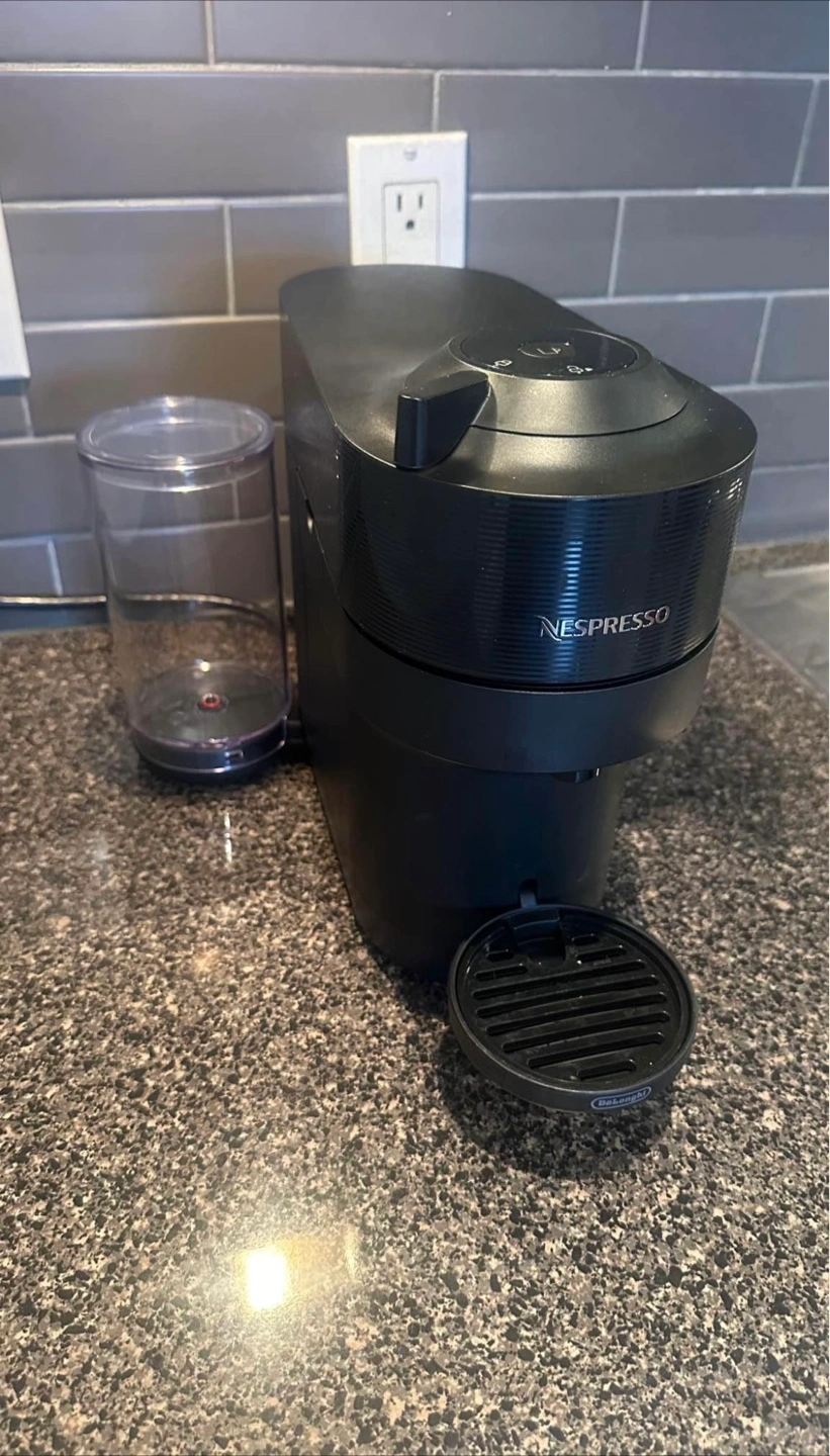 Brew your favourite coffee with this Black Nespresso Vertuo Pop+ machine, compatible with Nespresso Vertuo capsules for a variety of coffee styles and sizes. The machine comes with a starter pack of 12 coffee capsules so you can try different blends. This coffee maker is in great shape and ready to make your mornings better! * Features one-touch brewing * Includes a sample pack of Nespresso Vertuo capsules * Compact design fits any kitchen * Brews coffee and espresso I'm chuckling over here thinking about how someone will enjoy this cool coffee maker. But seriously, if you're reading this, it's still available!