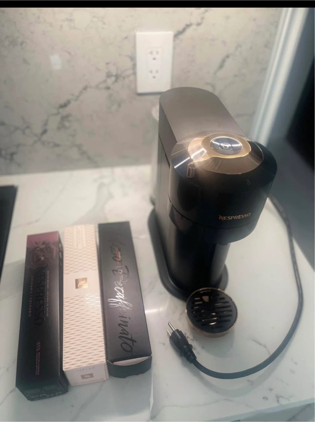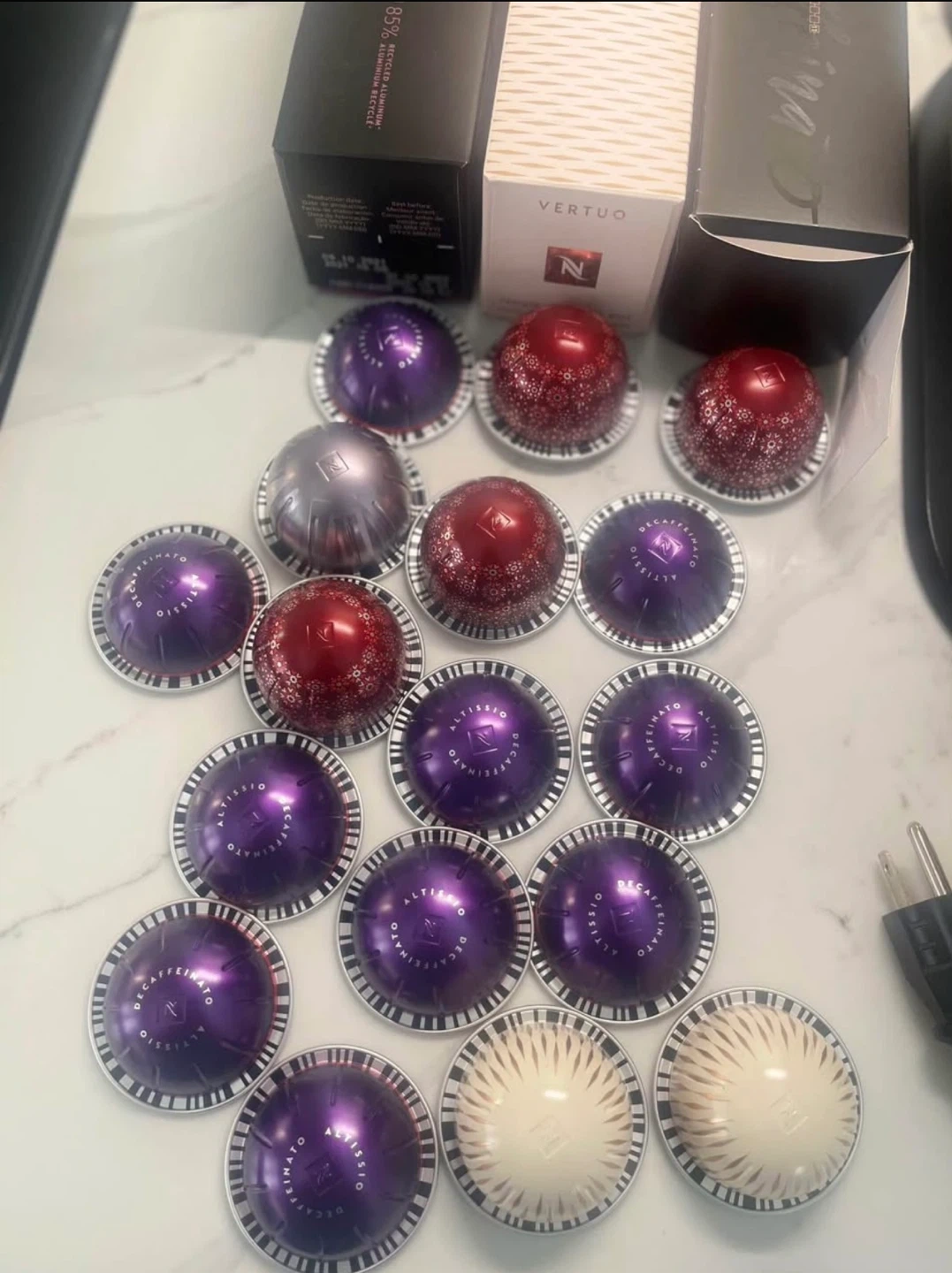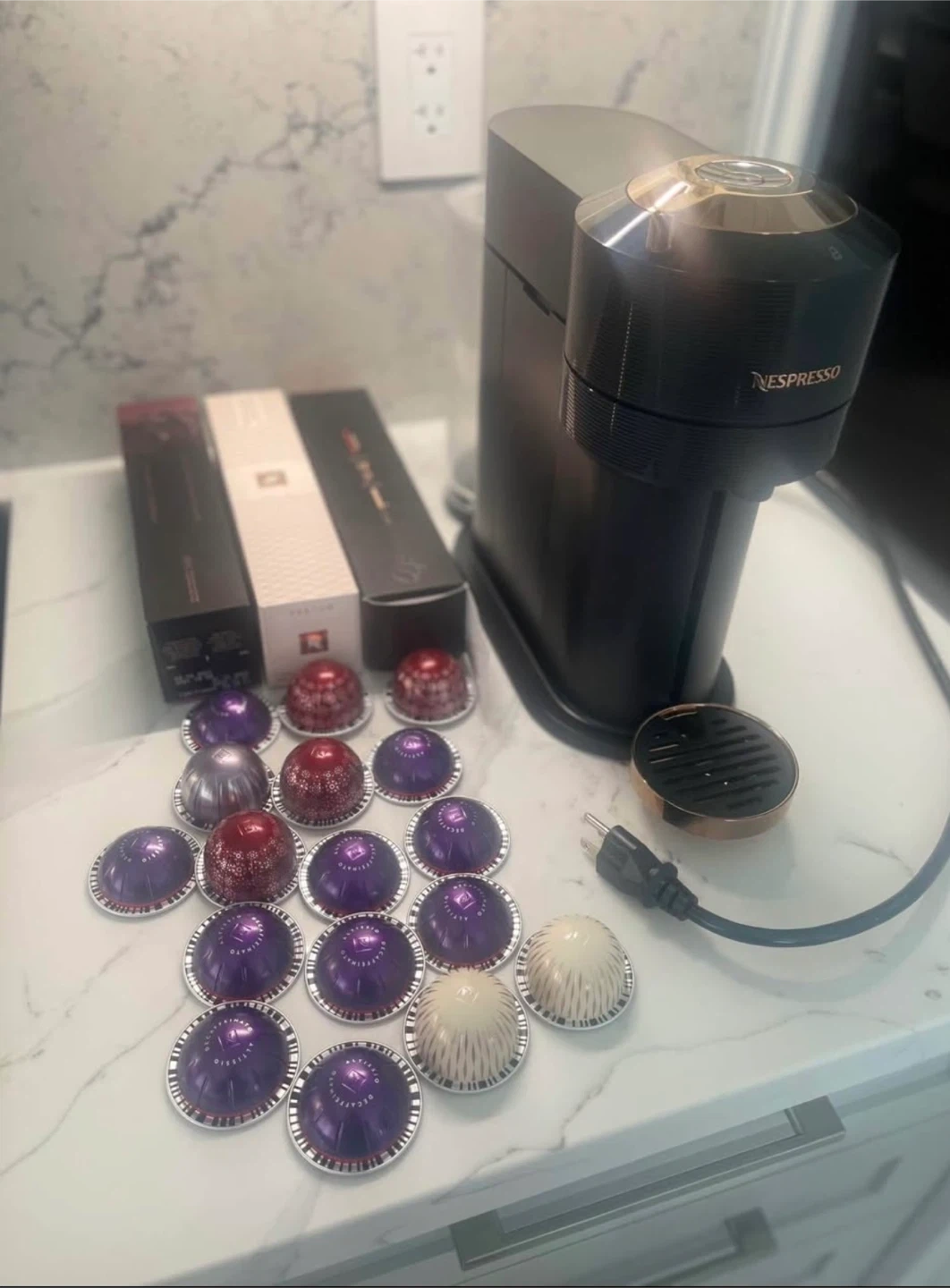 10Slightly used like new works great no issues 2 brand new boxes 1 opened missing 1 or 2 pods (brand new: Columbia, frosted caramel, opened melozio decaf Some separate pods included: altissio decaf (10), gingerbread (4), frosted caramel (2), alto dolce (1)