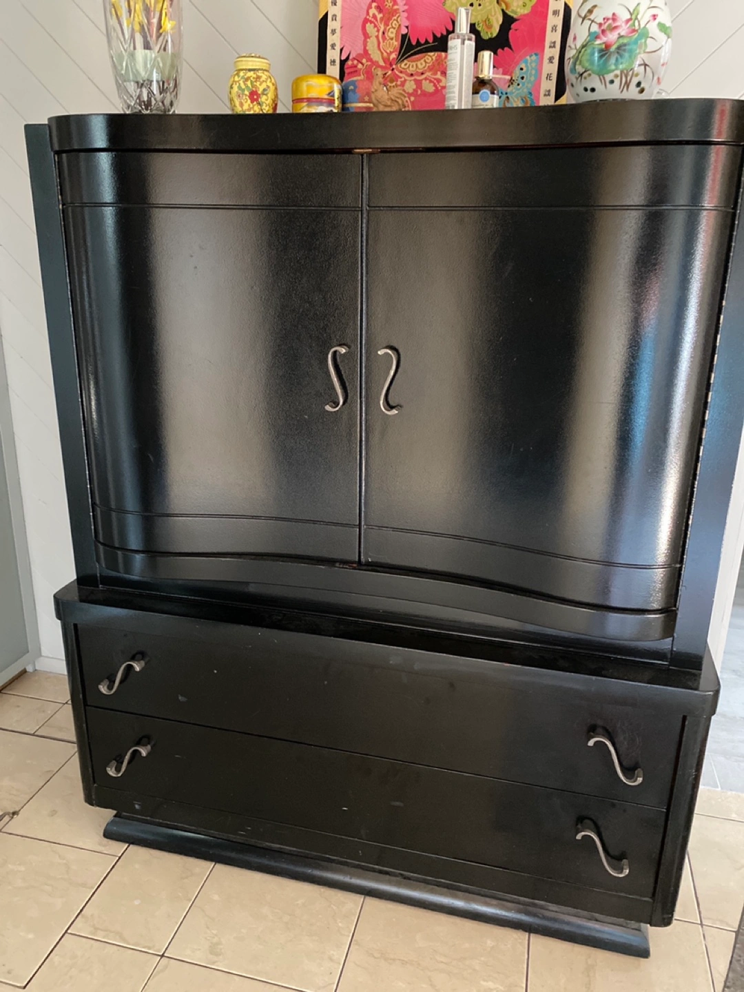 Selling a black armoire with drawers. It features a unique curved design and silver-toned handles. The armoire has a combination of cabinet space and drawers, offering plenty of storage. Perfect for adding a touch of elegance to any room!