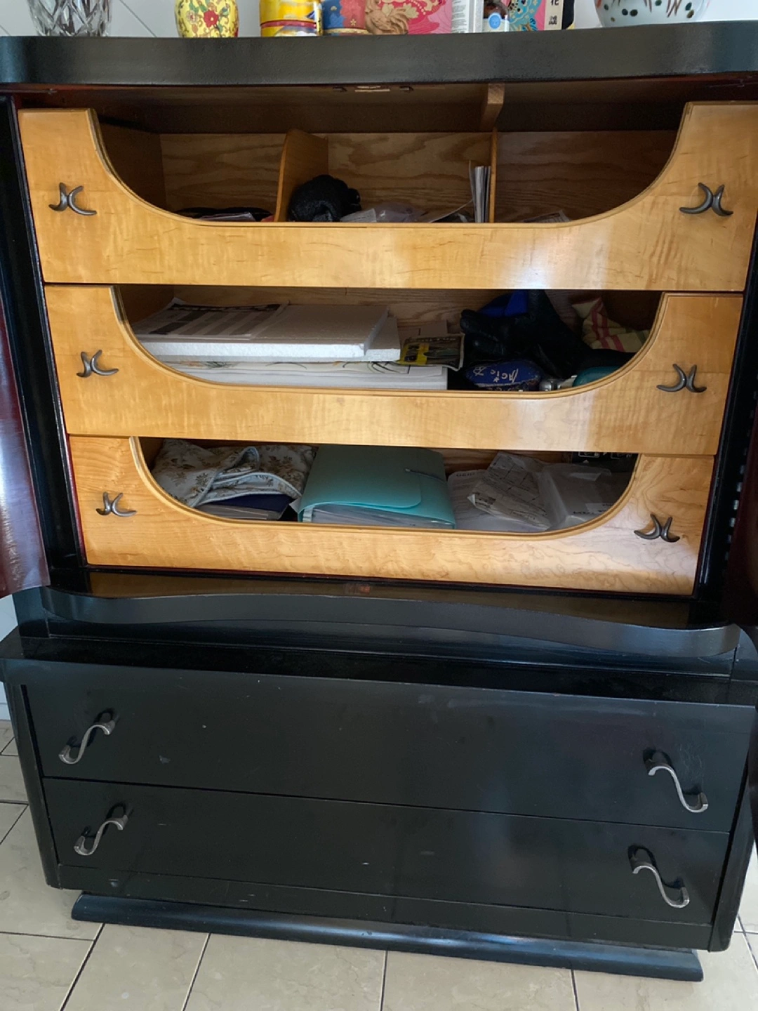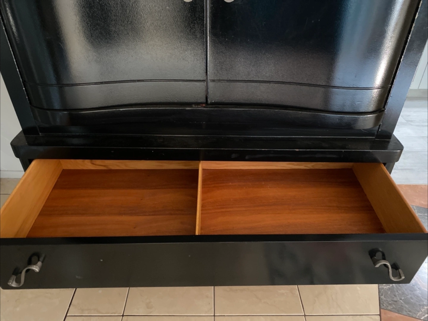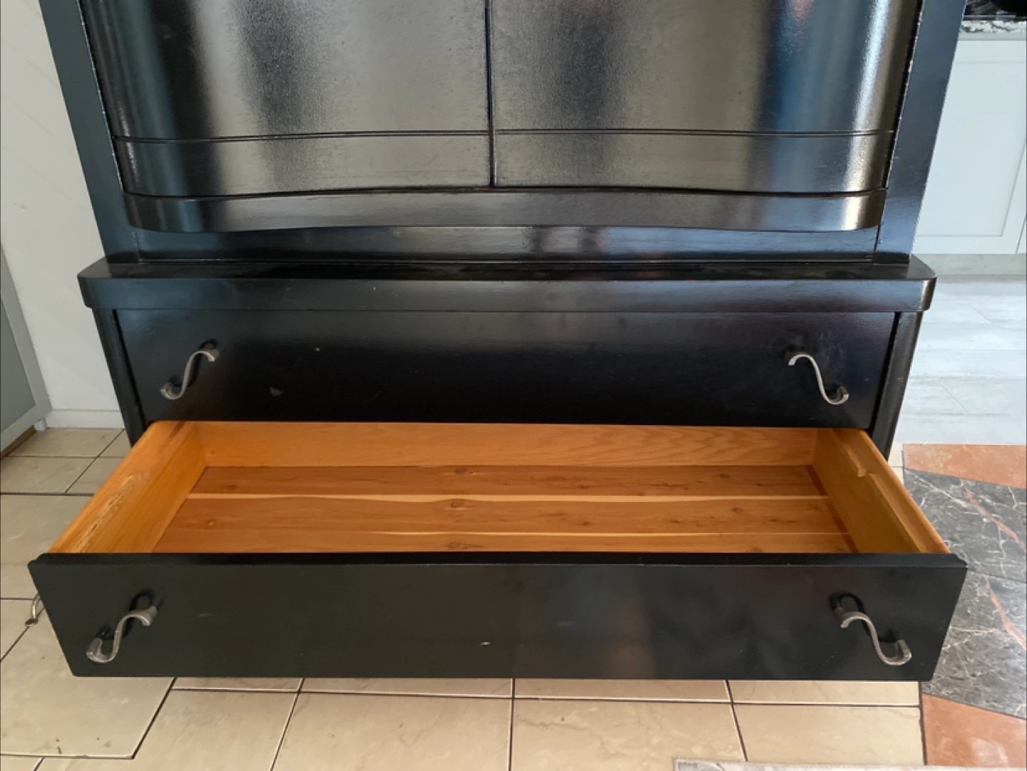 Selling a black armoire with drawers. It features a unique curved design and silver-toned handles. The armoire has a combination of cabinet space and drawers, offering plenty of storage. Perfect for adding a touch of elegance to any room!