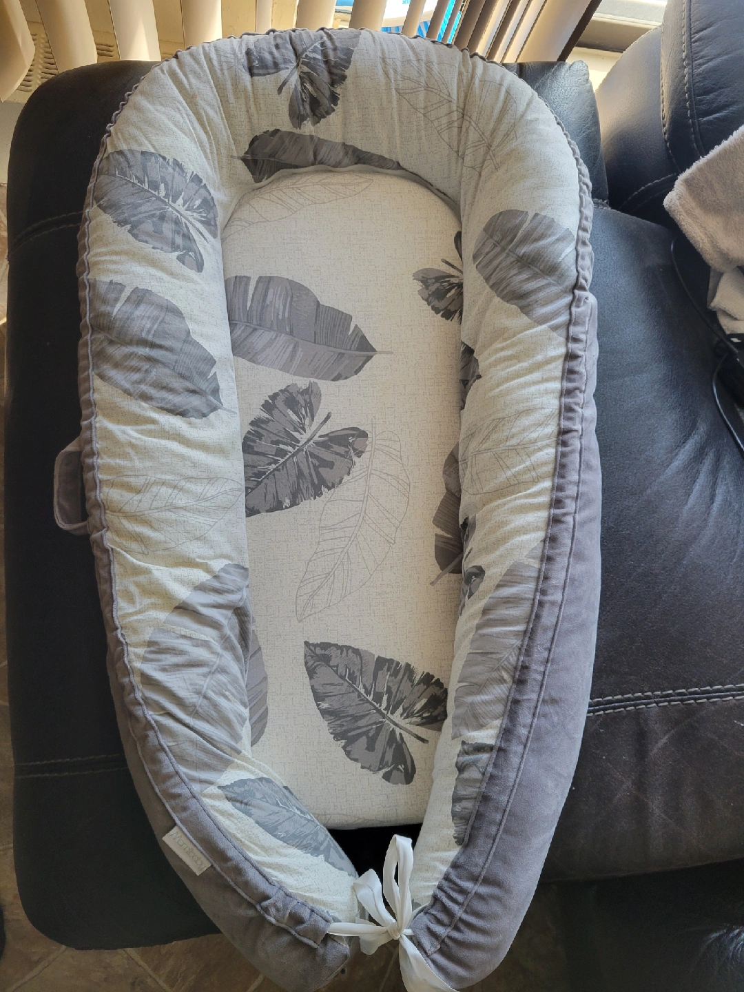 10A cozy nest baby lounger with a grey leaf pattern! It's in great condition and perfect for your little one