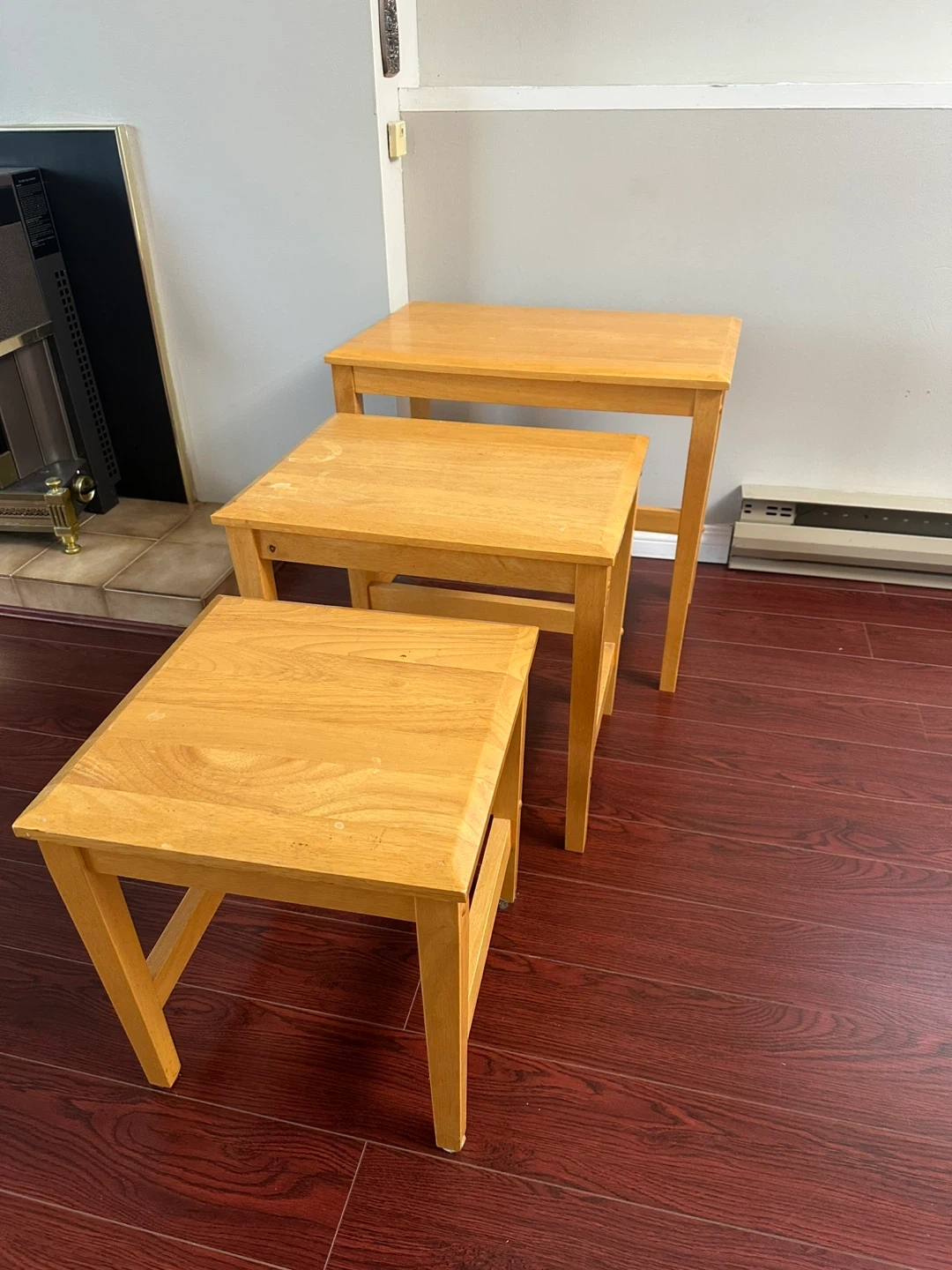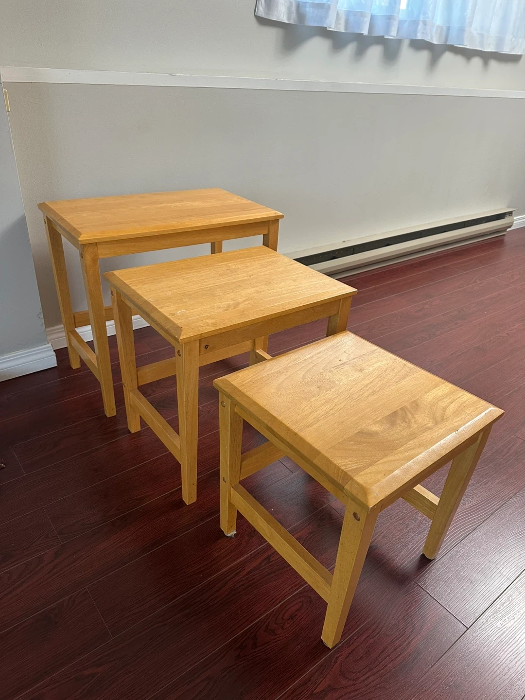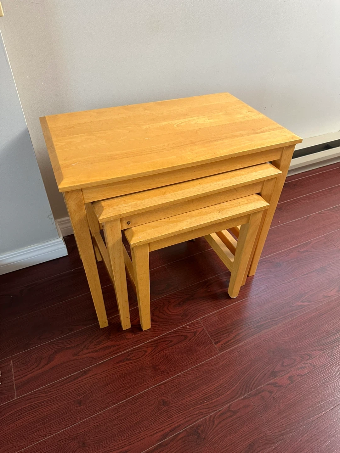 60Selling a set of three nesting tables! These are great space savers and perfect for small apartments or condos. They're in good condition and ready for a new home. The light wood colour goes with almost any decor