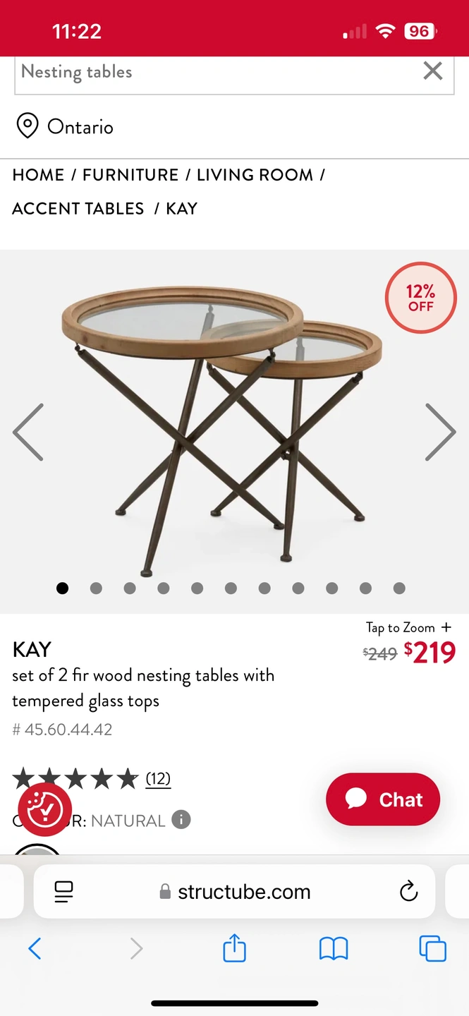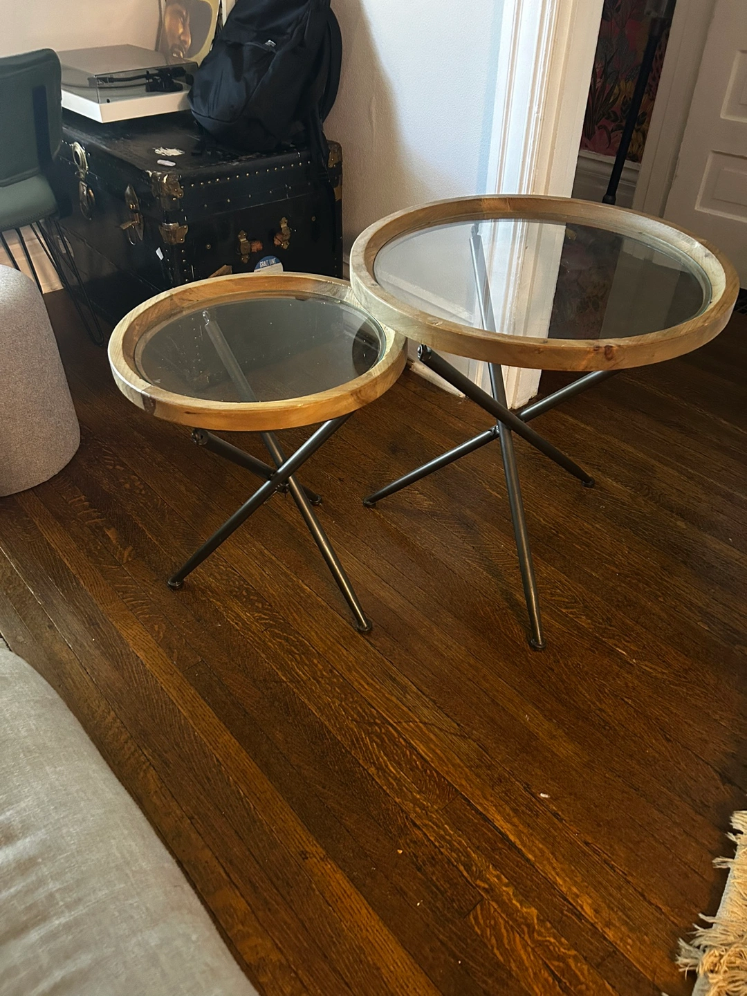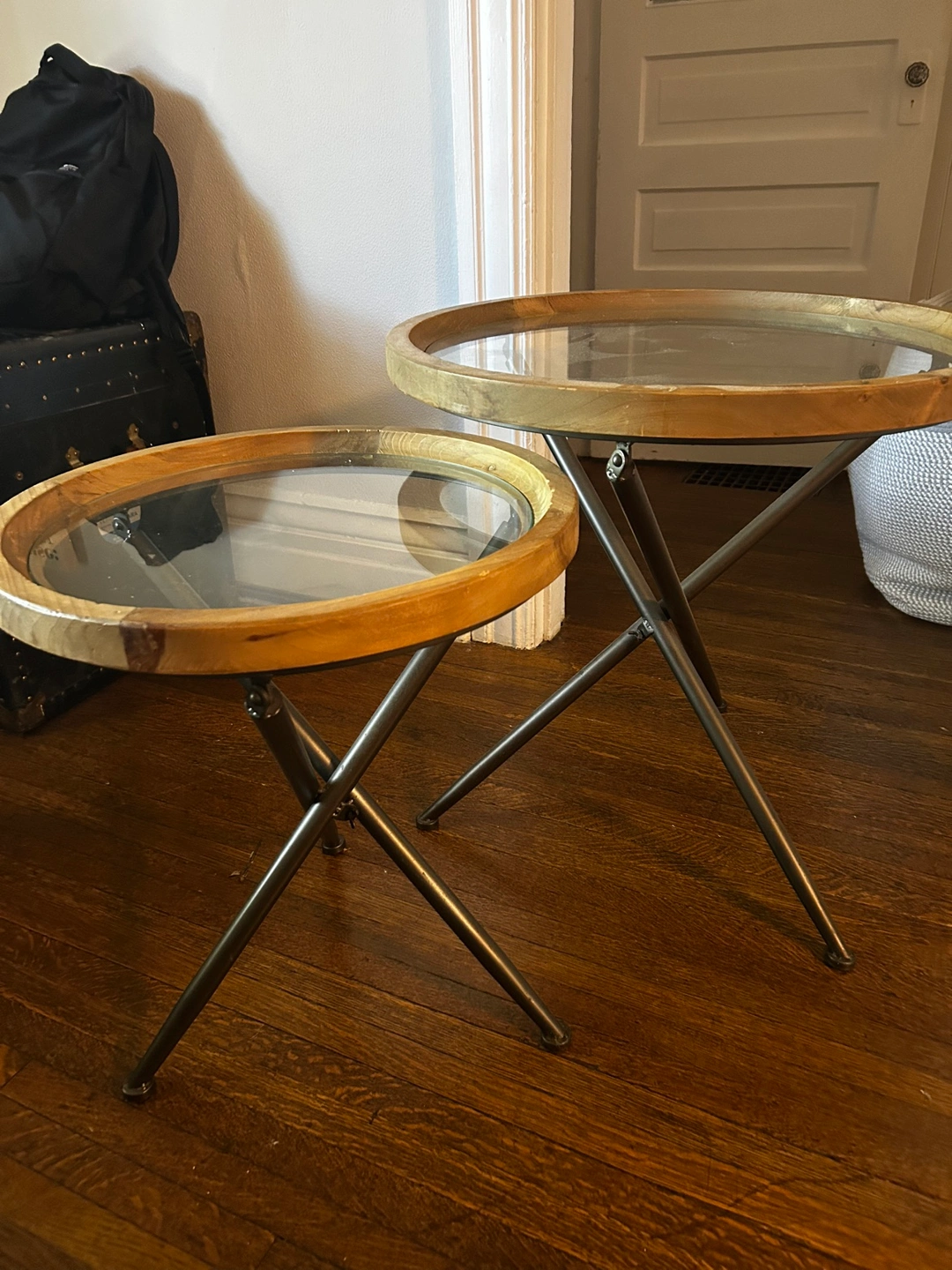 Set of two nesting tables with wood tops and glass inserts. The tables feature a metal, cross-shaped base. Model name : KAY Structube set of 2 fir wood nesting tables with tempered glass tops Small table dimensions: 55.5cm x 50cm x 50cm (22" x 20" x 20") Large table dimensions: 65cm x 65cm x 65cm (25.5" x 25.5" x 25.5")