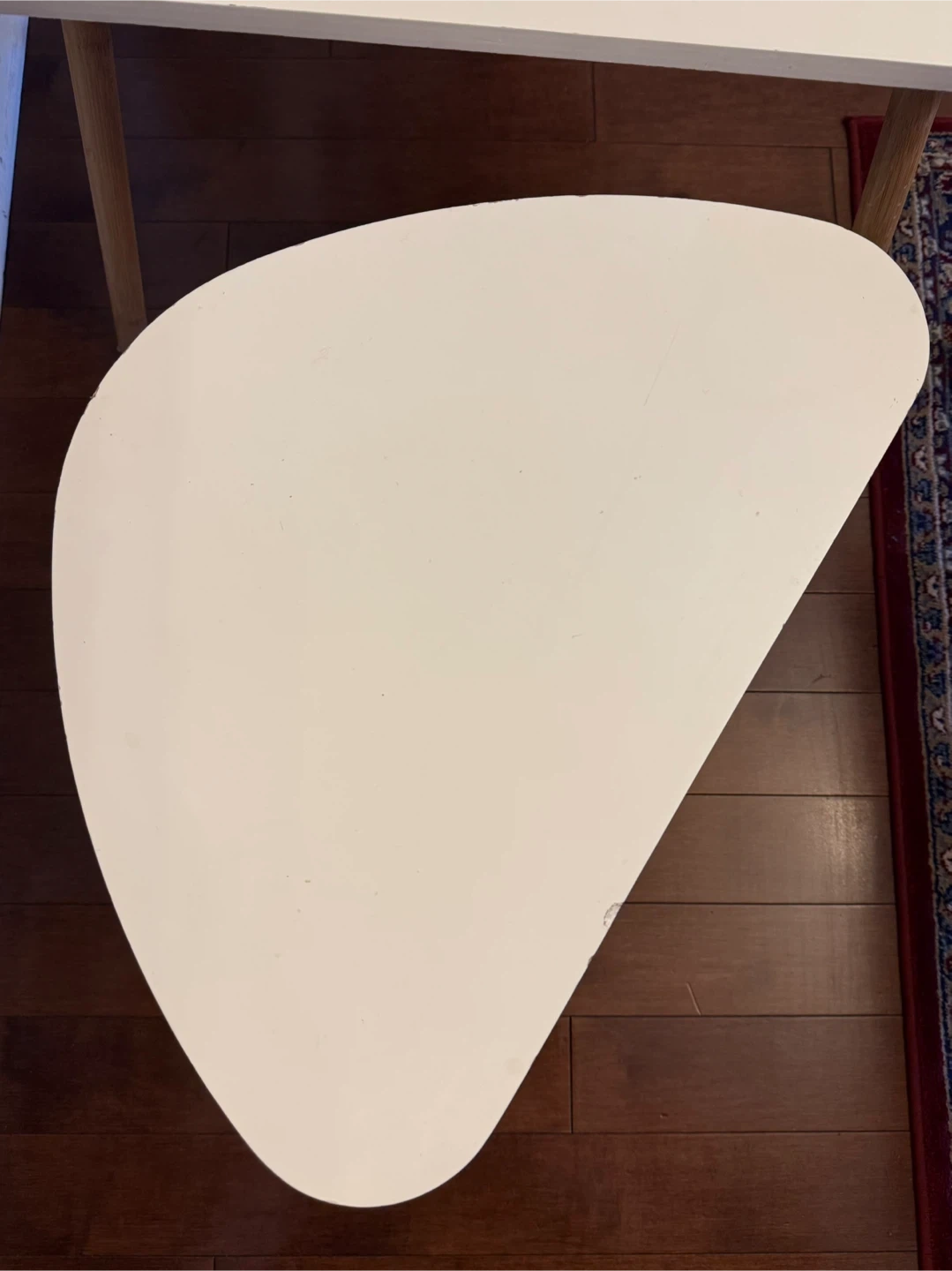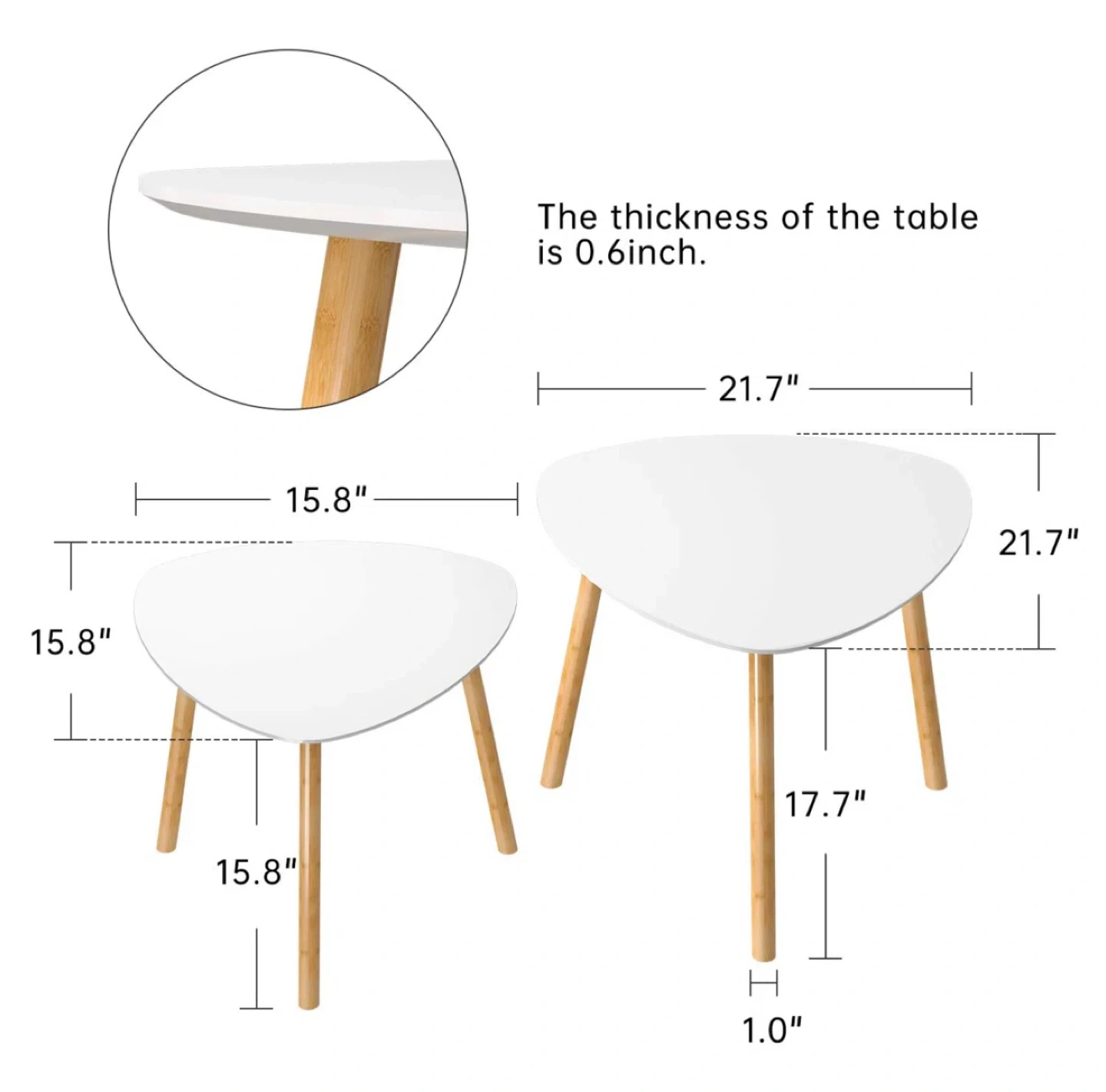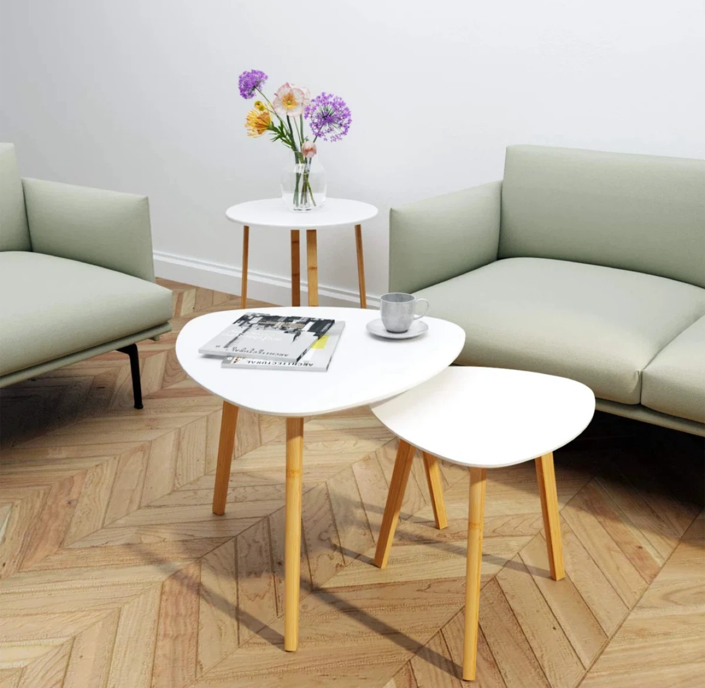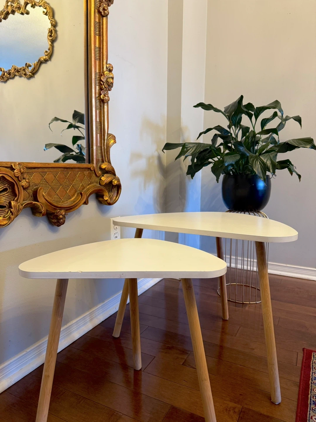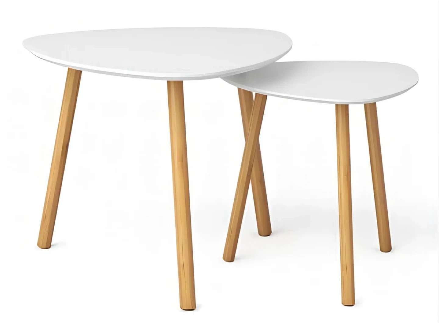 Cute set of two nesting coffee tables from WayFair.com that retail for $349.99. They're white with wooden legs, and have a unique, modern triangular shape. Perfect for adding a stylish touch to any room. There are some minor signs of wear on the surface, but they're still in very good condition and are looking for a new home!