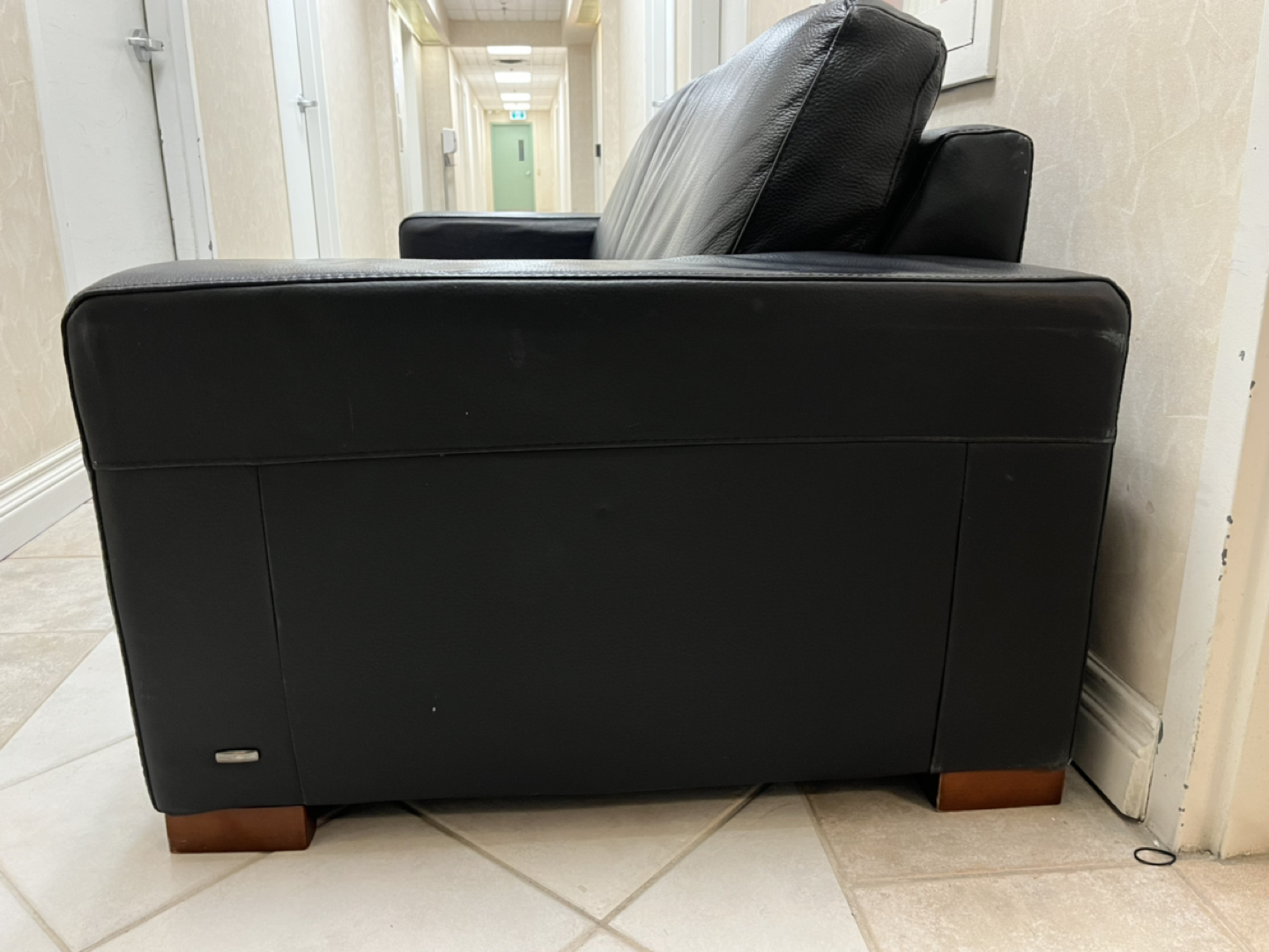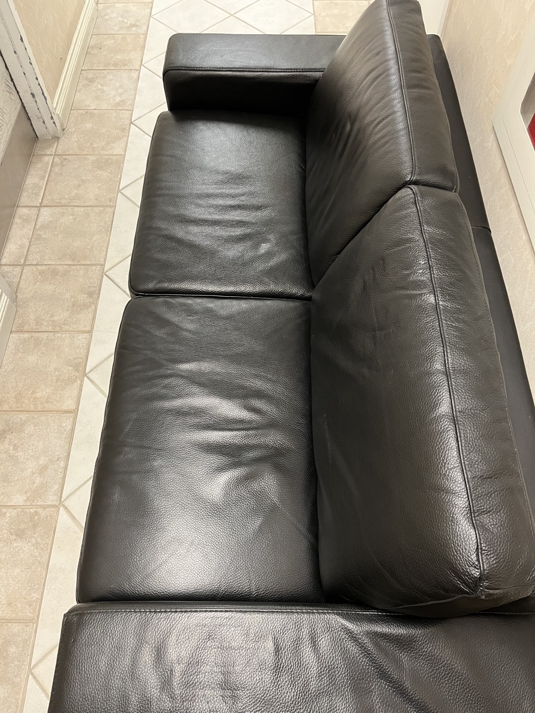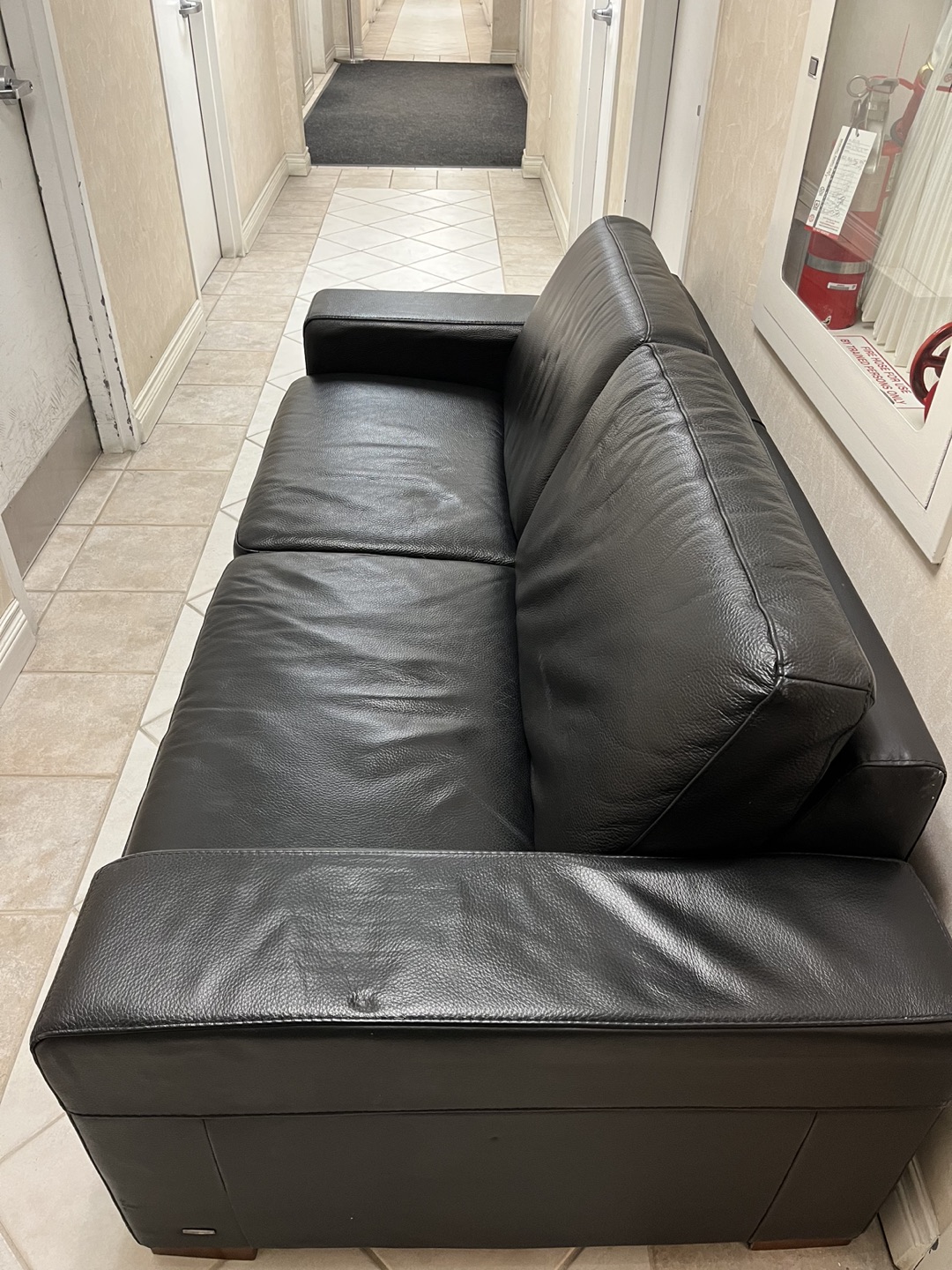 101 Netuzzi Editions genuine black leather sofa. Excellent condition. Sofa is 211cm (83”) long, 92cm (36”) wide and 82cm (32”) high. Located off of Yonge s of Finch.