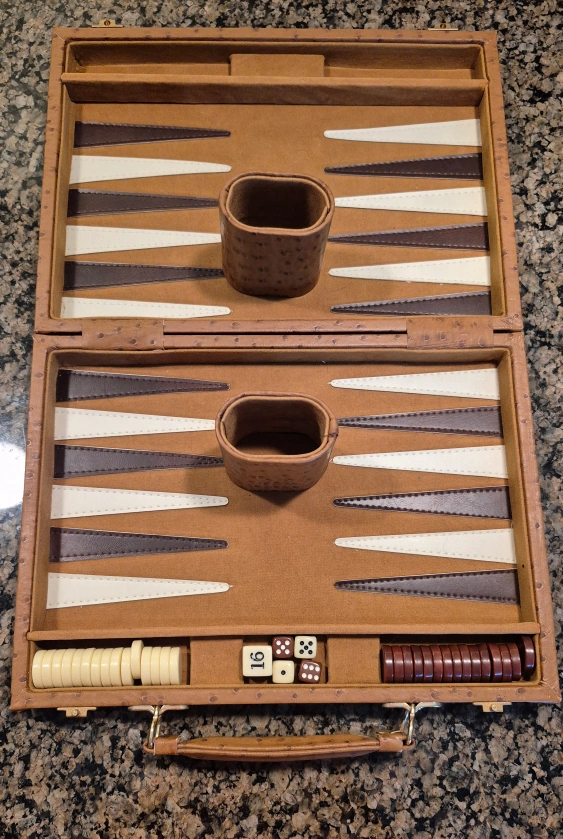 Selling a backgammon game set! It comes in a stylish brown leather-like carrying case. All the pieces are included, as well as the dice and doubling cube. It's ready for a new home!