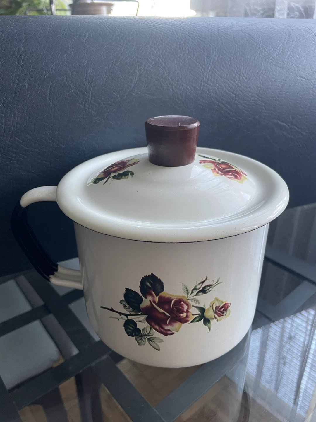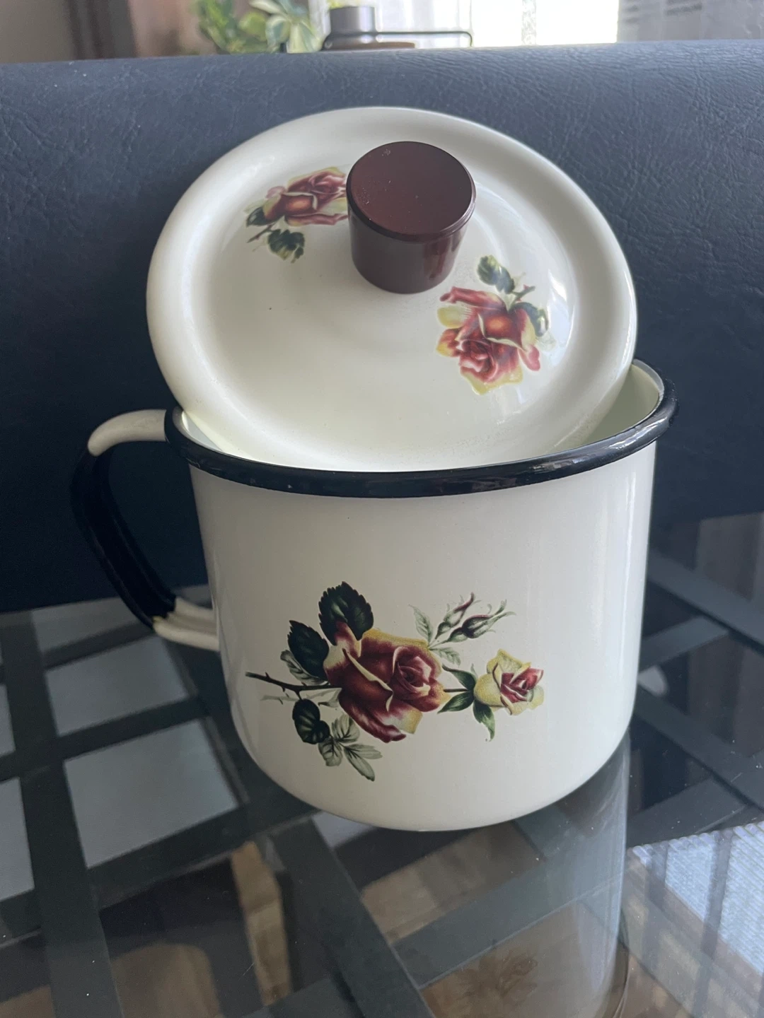 New enamel storage pot featuring a rose floral pattern. Includes a matching lid with a dark brown knob. 5” wide and 4” high.