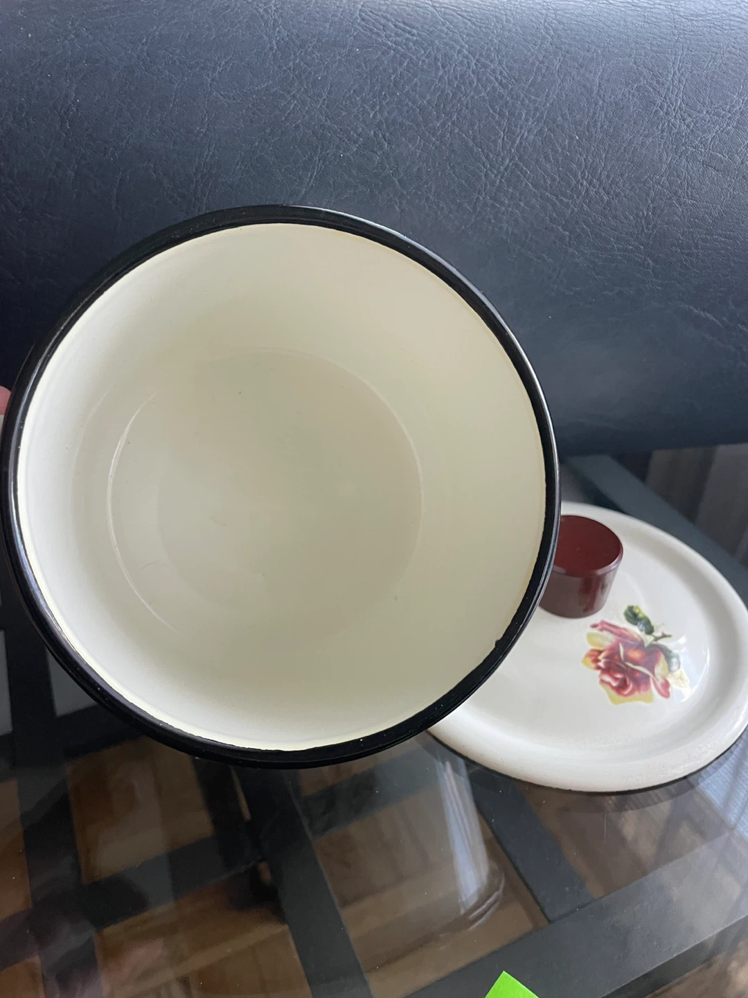 New enamel storage pot featuring a rose floral pattern. Includes a matching lid with a dark brown knob. 5” wide and 4” high.