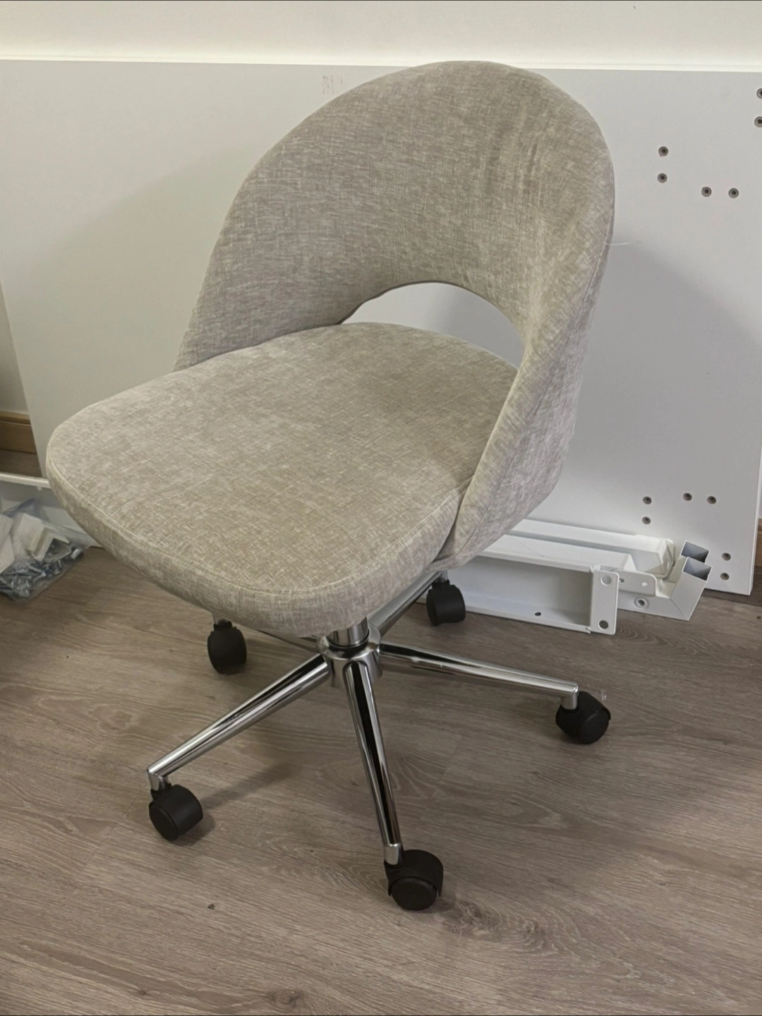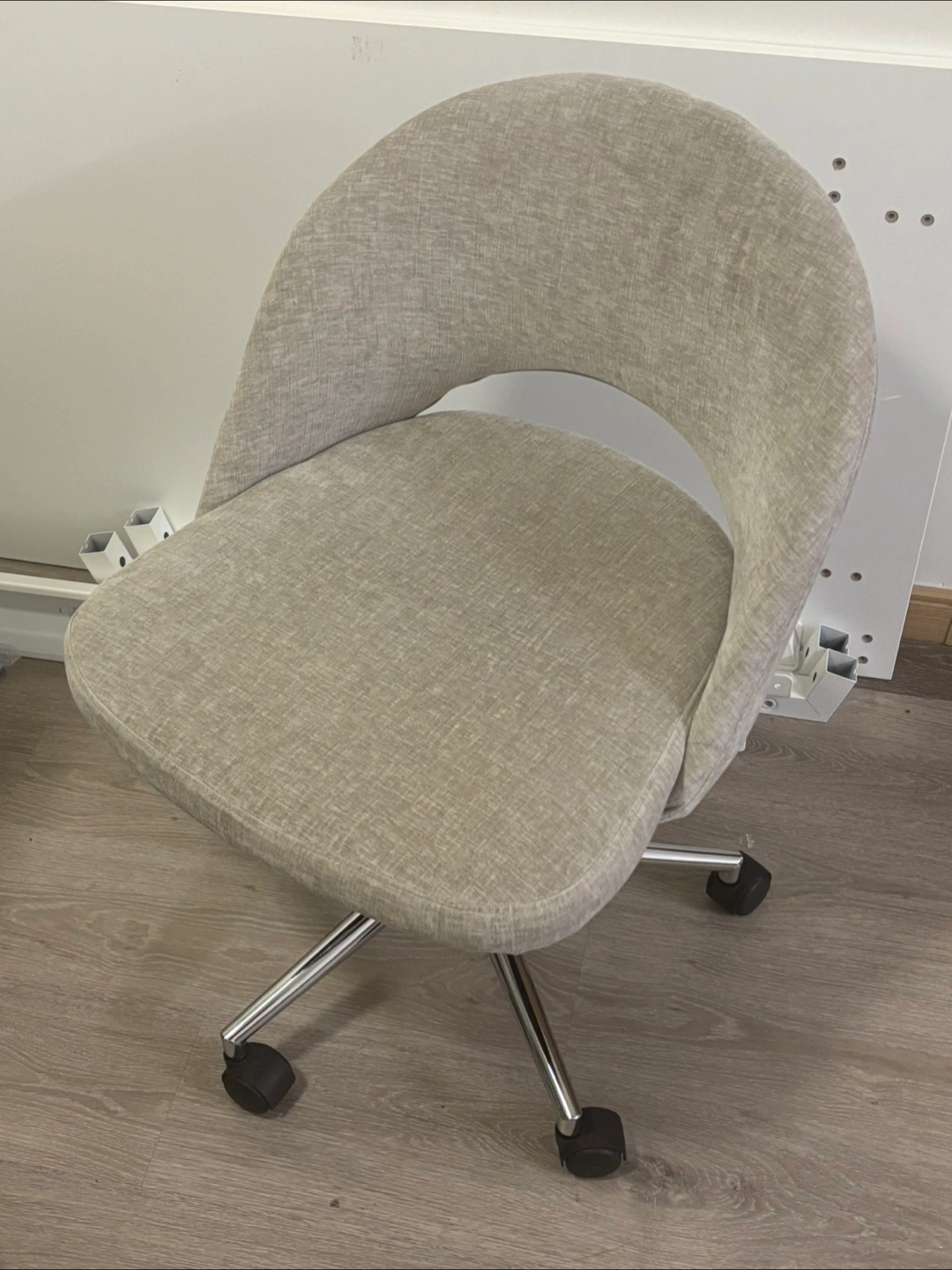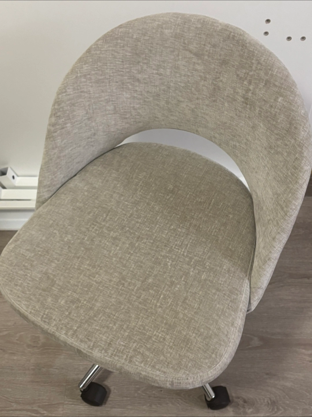 Selling a comfy upholstered office chair. It features a neutral colour and a sturdy base with wheels. Great for a home office or study space! Like new just bought 2 months. Barely used. I have 2 of it and originally price was 149$ not tax yet