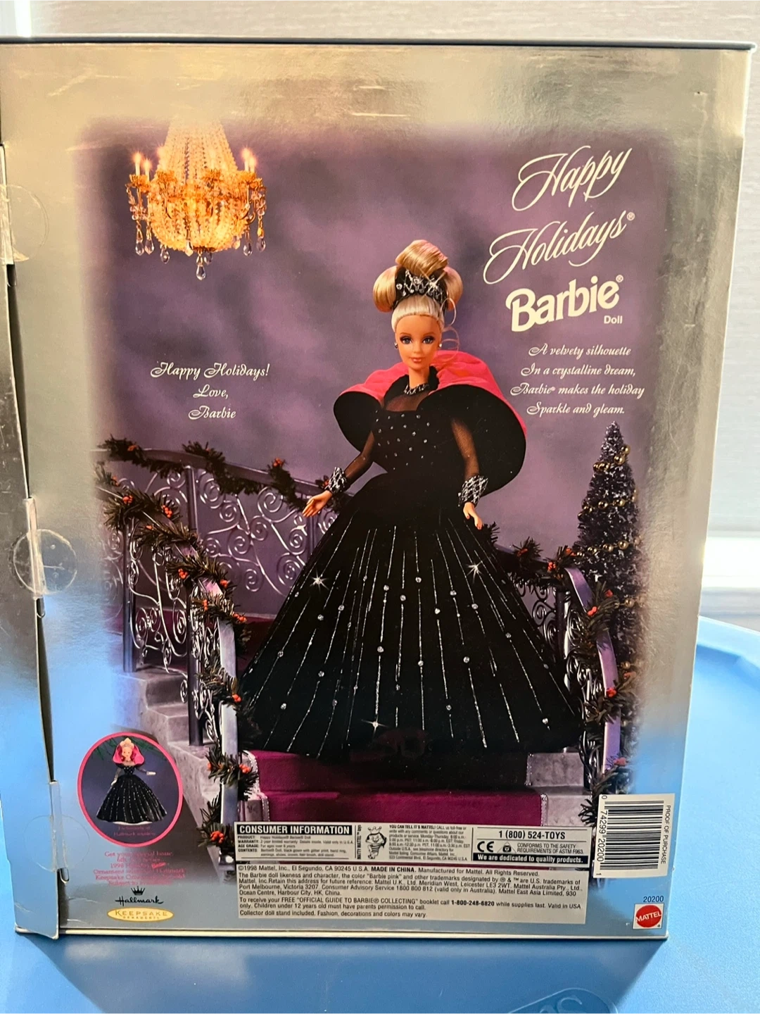 This is the 1997 Happy Holidays Barbie Doll, a Special Edition release. She's dressed in a velvety silhouette gown with sparkling accents. Includes her original box and packaging. A beautiful collectible for any Barbie enthusiast!