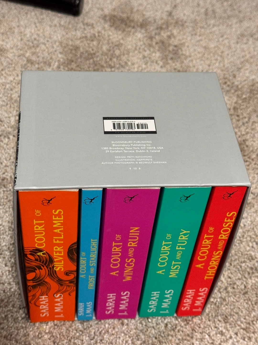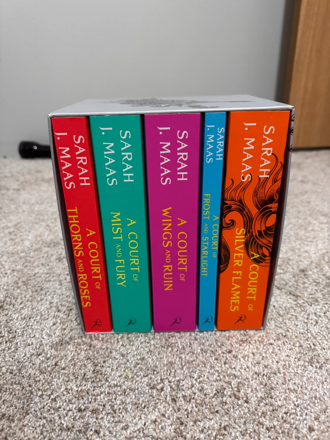 102Selling the complete A Court of Thorns and Roses series box set by Sarah J. Maas! Includes all five books in the series: - A Court of Thorns and Roses - A Court of Mist and Fury - A Court of Wings and Ruin - A Court of Frost and Starlight - A Court of Silver Flames Perfect for any fantasy lover!