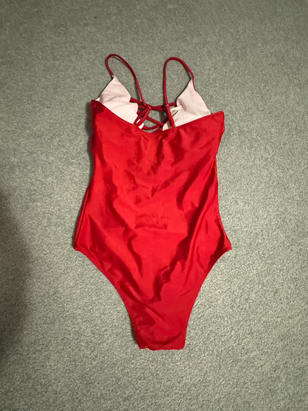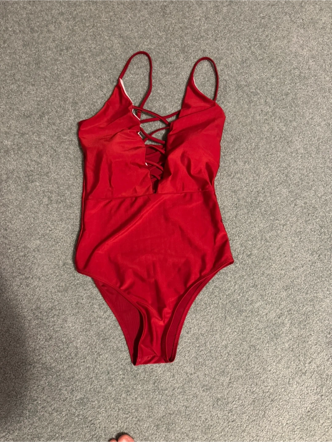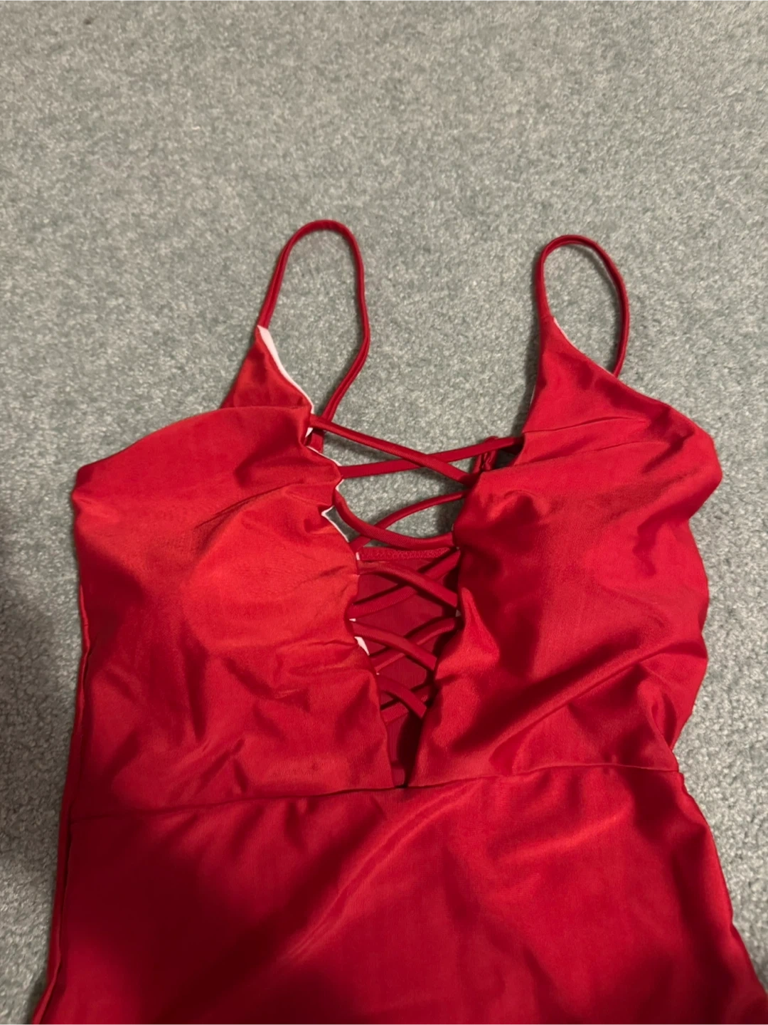 Selling a cute red one-piece swimsuit! It's never been worn and features a stylish lace-up design in the front. Perfect for the summer or your next vacation