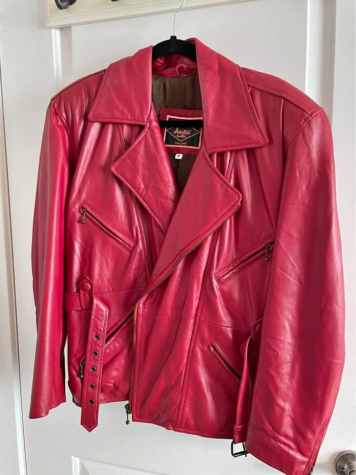 A soft leather jacket. 100% genuine leather. Size medium. Colour red.